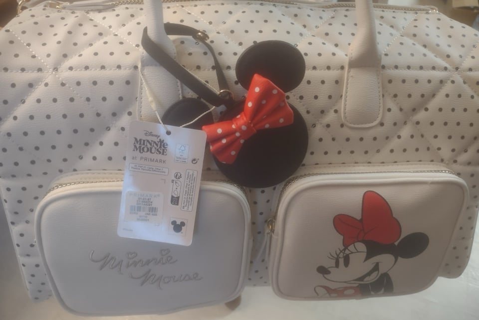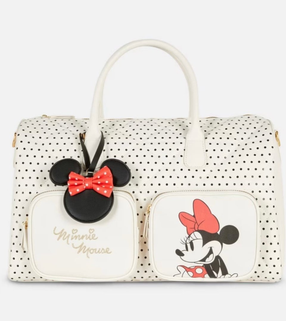 Minnie Mouse Quilted/Poke-a-dot Weekender Bag—a Primary Exclusive item. Showcasing a portrait of Minnie on one packet and her signature on the other pocket. Vegan leather zipper pulls and a large removable Minnie ear and red bow bag charm. The main body of the front is also quilted with a poke-a-dot design. This weekender bag is the perfect way to add a unique, officially-licensed Disney flair to your collection. Look for our other items to complete this collection!