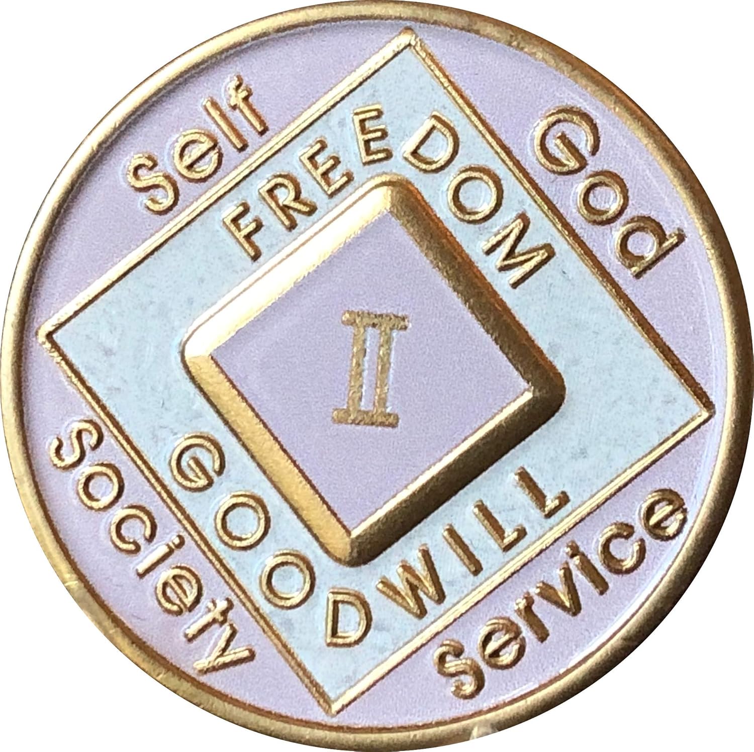 Stunning 2 Year Pink and White Color NA Medallion with the II symbol in the center. Size is 1 5/16" or 34x2mm This is an Official Narcotics Anonymous Medallion featuring raised 3D Graphics and Text back of the coin is black color. If it doesn't say NA on the back its not official. Excellent sobriety gift