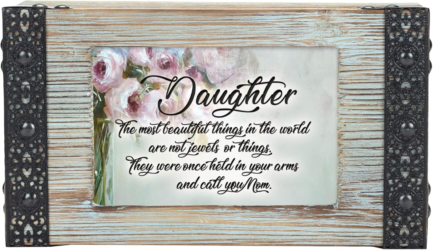 Cottage Garden inspirational and sentimental products are both lovely and classic in style. Be encouraged by message that reads, "The most beautiful things in the world are not jewels or things. They were once held in your arms and forever call you mom." Designed by artist in the Heartland of America, Cottage Garden’s Collections reach a variety of tastes and have a wide range of occasions for gifting. Made with a mix of solid wood materials and metal fasteners; Trendy distressed wood design with a patina like celadon green finish Jewelry box measures approximately 9.75 x 5.5 x 3.75 inches; Metal straps with lace, lattice work pattern, adds interest to your home accents. Replace artwork with your own 6 x 4 inch personal photo. Traditional wind-up mechanism engages music to play melodic tune You Are My Sunshine. Vintage like key and lock design closure to secure your little treasures and keepsakes; Gorgeous for display on table tops, nestle in shelf arrangements or mantel. Ships in protective packaging; Ready for giving to that special someone.