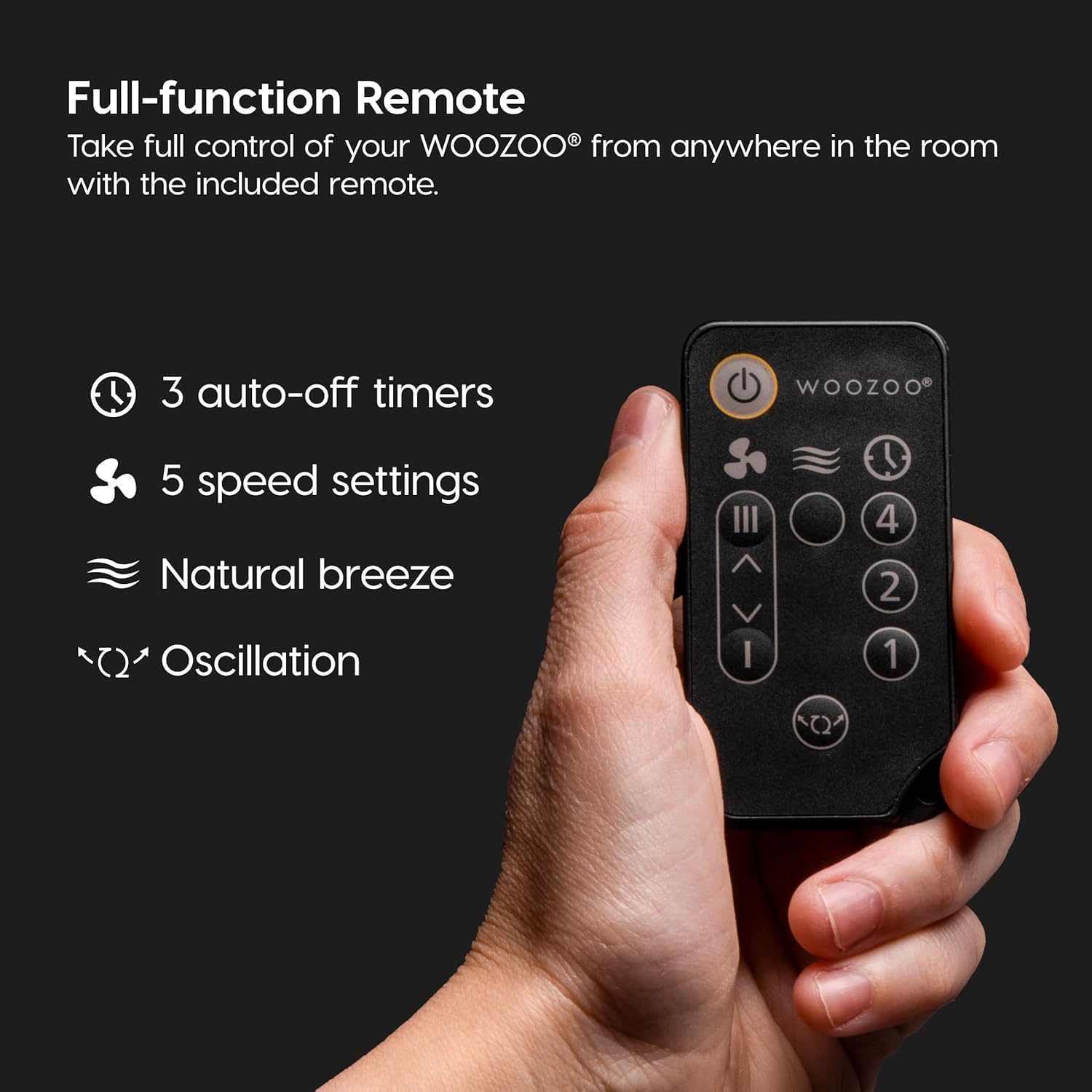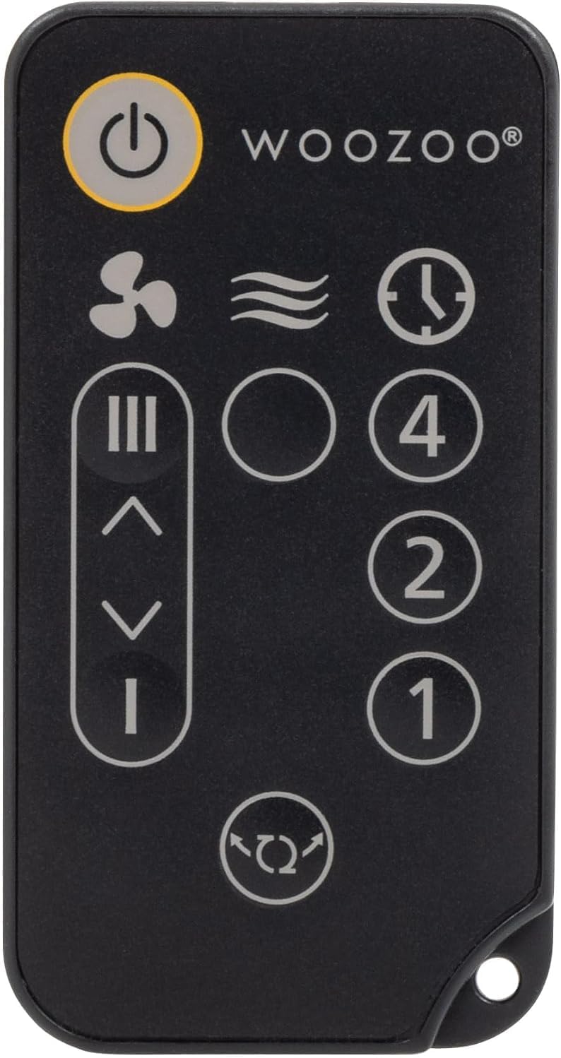 Maximize air flow in your house, office, or dorm with this WOOZOO remote controlled fan. The powerful yet compact unit comes with a remote to let you control your desired settings from across the room. Five speed settings let you adjust air flow to your desired strength, and the optional natural breeze setting imitates the feeling of the outdoors. The fan oscillates left and right to reach the whole room and features six vertical manual tilt settings. Enjoy extra-quiet cooling on the circulator’s virtually silent 'low' setting for when you want to study, sleep, or relax without any noise distractions, and use of the optional 1, 2, and 4 hour auto-off timer settings to save energy. The desktop fan provides up to 353 ft² area coverage, and the 70 inch cord makes it easy to reach the nearest open outlet.