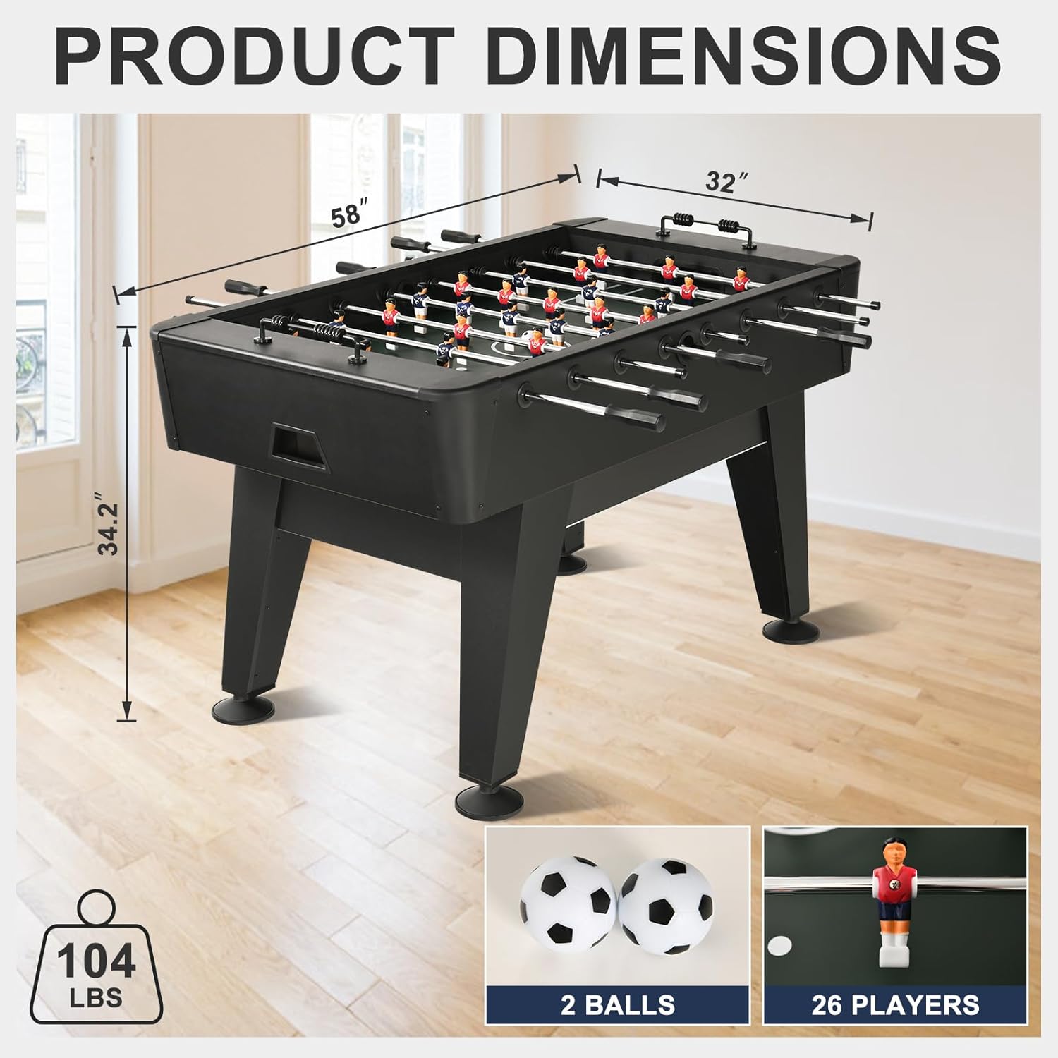 This is a RAYKEEP 58“ foosball table, which will bring you a pleasant game experience in your leisure time! Features: ①Our soccer game table is made of premium MDF materials sturdy and durable. ②Four enlarged foot discs ensure maximum stability and protect the floor ③The ergonomic handle is for comfortable use ④The stainless steel hollow pole rotates freely adding to the smoothness of speed games. ⑤With rounded edges to prevent accidental bumps and injuries. ⑥low-friction realistic sports field design ⑦Bead style scoring device helps keep track of the game process conveniently. ⑧Internal goal and ball collector for easy retrieval. ⑨Easy to Assembly: Includes illustrated step-by-step instructions and all hardware delivered Specification: Material: MDF, Steel Overall Dimension: 58'' x 32'' x 34''(L x W x H). Net Weight: 103.62 lbs. Package includes: 1 X Football Table (Assembly is required) 8 X Steel Rods 26 X Players 2 X Footballs 1 x Instruction Christmas Games - Looking for fun Christmas games for families. Our Tabletop foosball table is perfect for creating memorable moments and laughter at your holiday gatherings. Have some fun friendly competition this Christmas