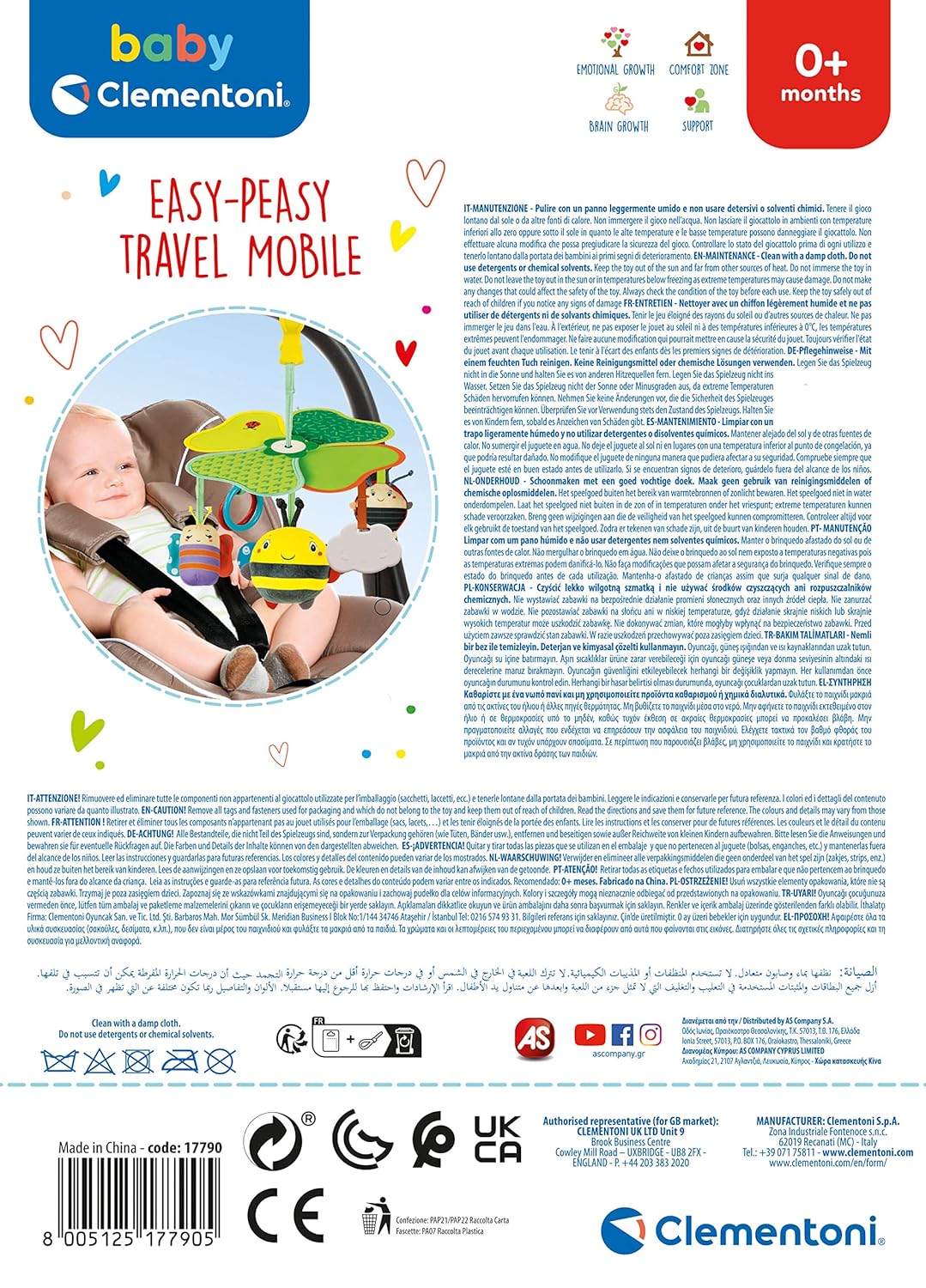 A sweet and colourful Baby Clementoni mobile that is easy to attach to your stroller, to take the fun wherever you go! Sweet characters and lots of activities to entertain little ones: colourful pendants with rustling elements, sound effects and chewing parts to intrigue and entertain the newborn with many sensory activities. Lightweight and safe for the little ones, practical and convenient to carry with you for parents, easy to carry and store, thanks to the collapsible flower structure folds on itself and can be easily stored in your bag. Thanks to the practical clip it can be hung anywhere: from the pram, to the crib, to the car seat. Contrasting colors stimulate vision, rattles stimulate auditory perception, rustling elements encourage exploration with your hands. Discover the entire Easy-Peasy line of Clementoni designed in travel format for families on the go. An ideal travel game from the first months of life.