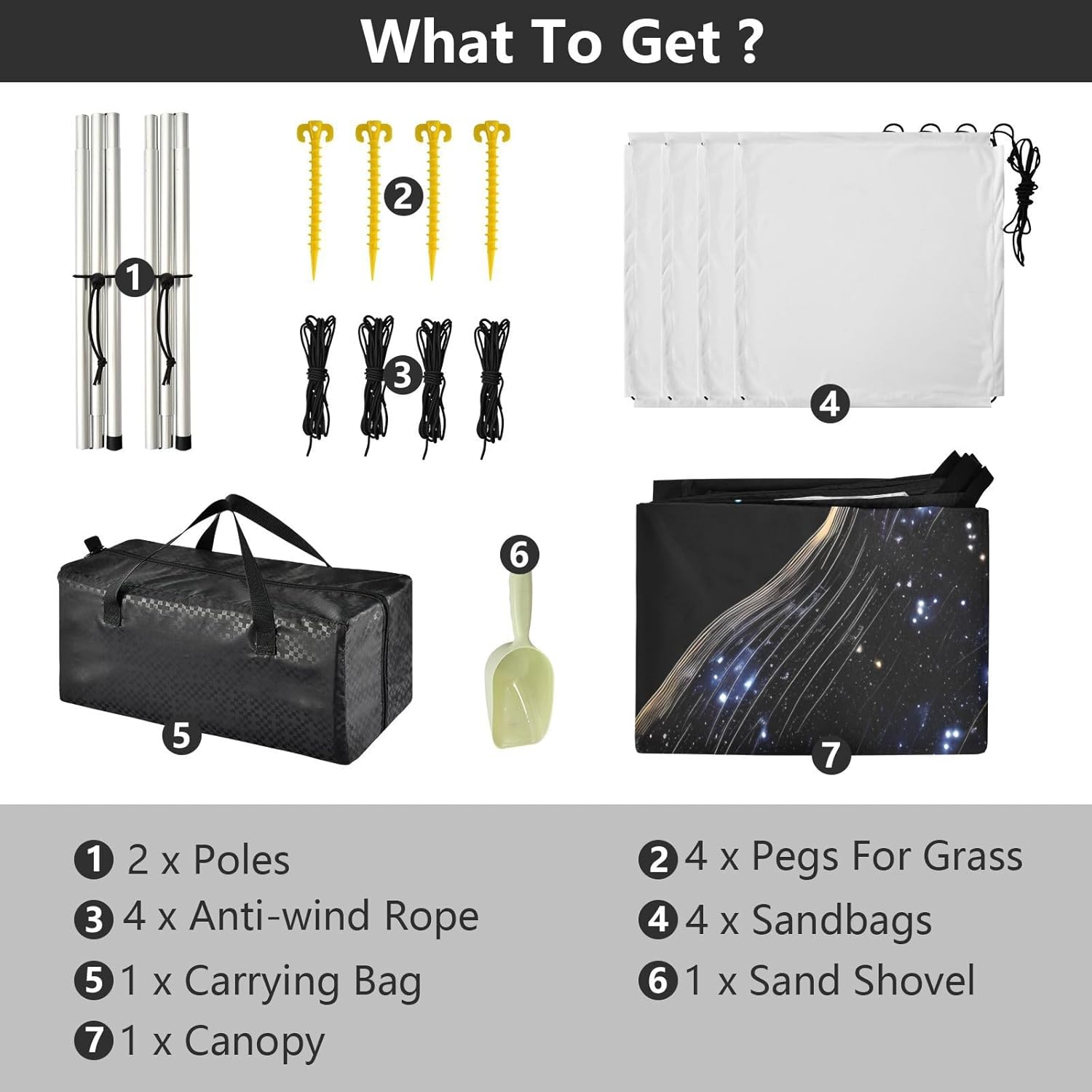 • BETTER WIND STABILITY: Canopy owns 2 reinforced poles & 4 sandbags (with shovel) & 4 guy ropes & 4 stakes. Achieved double the wind resistance.