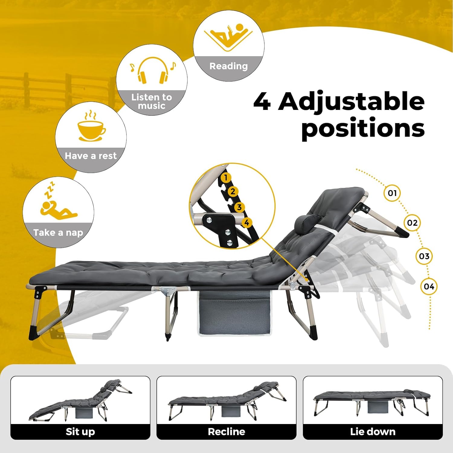 DescriptionDiscover the ultimate outdoor companion with our camping folding beds! These lightweight, portable beds are designed for easy transport, ensuring you can enjoy a comfortable night’s sleep whether you’re at a campsite or in your backyard. With sturdy construction and breathable materials, you’ll stay relaxed and cozy all night long. From foldable beds to portable mattresses, we have everything you need for a restful outdoor experience. Embrace the great outdoors without sacrificing comfort—your adventure awaits!Key featuresPortable folding camping cot2-In-1 design4-Position adjustable backrest200kg Load-bearing600D Oxford fabricComfortable and removable cushionConvenient side pocketsThick tubeSturdy structureDurable and versatileSpecificationsBrand: LevedeMaterial: 600D Oxford fabric, steelSteel pipe: 25mm x 0.7mmCushion thickness: 6cmSide pocket QTY: 2Load-bearing: 200kgBackrest length: 59cmChair length: 133cmDimensions (L x W x H):Unfolded: 190cm x 75cm x 30cmFolded: 78cm x 70cm x 17cmColour: Dark greyProduct Contents1 x Levede Folding Camping Cot1 x Pillow1 x PP Soft Cushion1 x Side Pocket