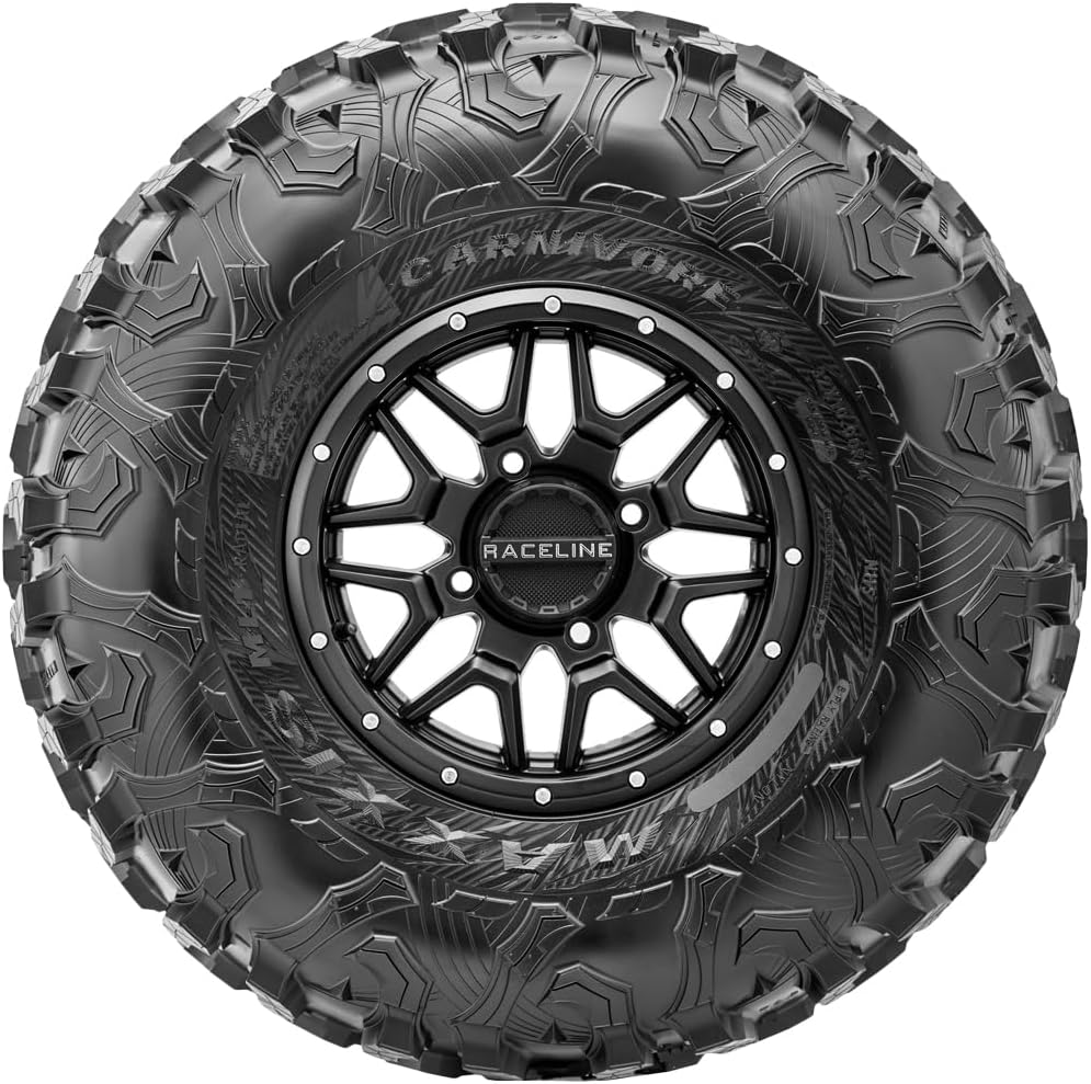 The Maxxis Carnivore is a true light truck inspired tire, engineered for performance in extreme west coast terrains. With an 8 ply radial carcass and a tread design that allows for ultimate control on and offroad, the Carnivore has the superb tread wear you expect from a Maxxis tire. This tire also features a specialized rubber compound for excellent traction on rocks, roots and desert terrains. 8 ply radial construction lets the Carnivore withstand the heavier loads and high speeds of your largest SxS machines. � Specialized rubber compound for supreme traction and control 8 ply rated radial construction with 23/32" tread depth Excellent for extreme terrains from hard pack to loose loam Light truck inspired side-by-side/quad tire with superb tread wear � Note: Wheel sold separately Available in the following ATV/UTV tire sizes: 28x10R-14, 29x9.5R-15,�30x10R-14, 31x10R-15 and�32x10R-14.
