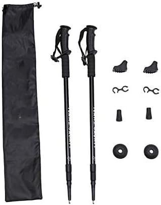 The handle is made of rubber, with EVA foam handle.The internal lock design is shock-absorbing, with a built-in shock-absorbing system, which effectively reduces the impact of terrain during use.After the double-row figure-eight fixing buckle is fixed, it is easy to store into the matching storage bag, and it is not easy to shake back and forth when it is portable.Tungsten steel rod tip, suitable for all terrain, with protective foot cover and mud support to make trekking poles lifelonger. The classic design mud support. Makes trekking poles less likely to fall into trouble when hiking in mud and sand.Protect the shoe cover, effectively protect the tip of the pole and extend the use time of the trekking pole when walking on roads and on sandy soil.Product Name: Three-section straight handle inner lock trekking poleRod body material: 6061 aluminum alloyTip material: tungsten steelHandle: rubber handleLength: 67-135CMWeight: 760g/set (including accessory). ies)Colour: BlackShock Absorption: Built-in shock absorption system