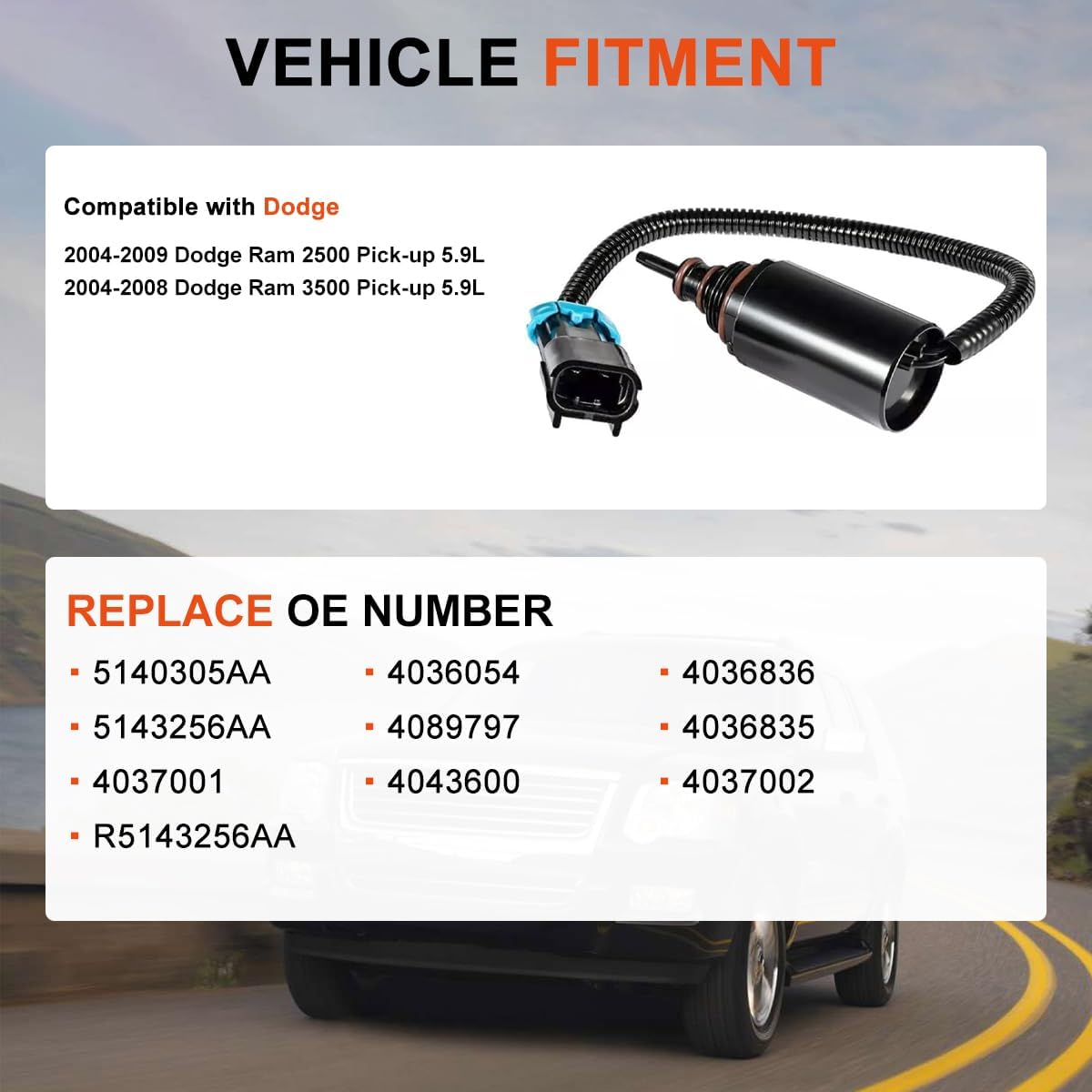 Easy and Direct Replacement Replaces Part Number: 5140305AA, 4036054, 4036836, 5143256AA, 4089797, 4036835, 4037001, 4043600, 4036836,4037002, R5143256AA Package included: 1 x Turbo Wastegate Control Solenoid (as shown in the pictures) Compatible with Dodge Ram 2500 Pick-up 5.9L L6 DIESEL Turbocharged (2004-2009) Compatible with Dodge Ram 3500 Pick-up 5.9L L6 DIESEL Turbocharged(2004-2008)