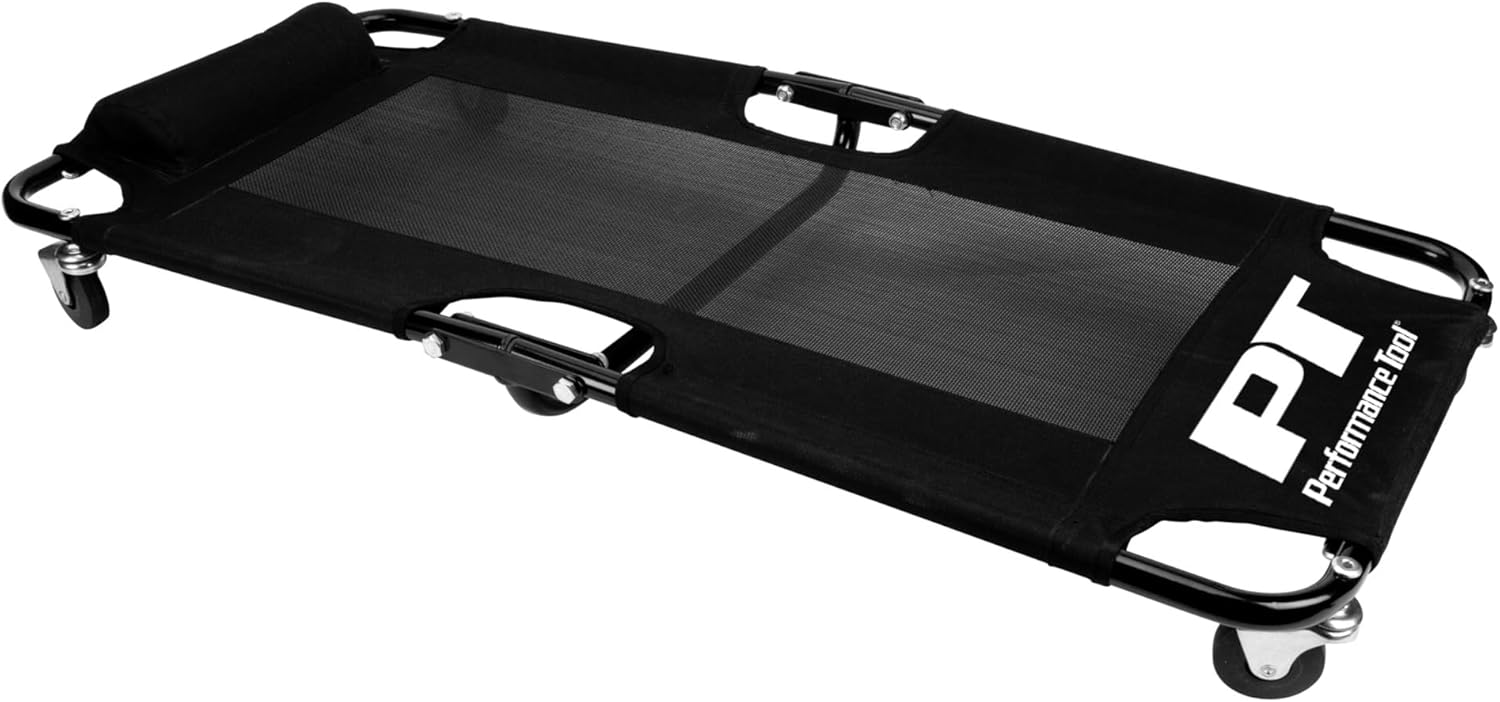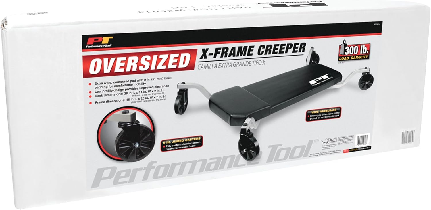 The Performance Tool W85014 X-Frame Creeper is the ultimate solution for your workspace needs. Its oversized design provides ample space for a comfortable work experience, measuring 38-Inch x frame oversized, while its low profile design ensures improved clearance and easy access to hard-to-reach areas. The creeper is fully padded with extra cushioning, providing added comfort and support while you work. Constructed with heavy-duty tubular steel frame, this creeper is built to last and withstand any job. The shielded 2-1/2-Inch (63.5mm) casters make it easy to maneuver this creeper around your workspace, whether you're working in a mechanic garage or workshop. Don't let discomfort and restricted access hold you back - get the Performance Tool W85014 X-Frame Creeper today and experience the ultimate in comfort, convenience, and durability.