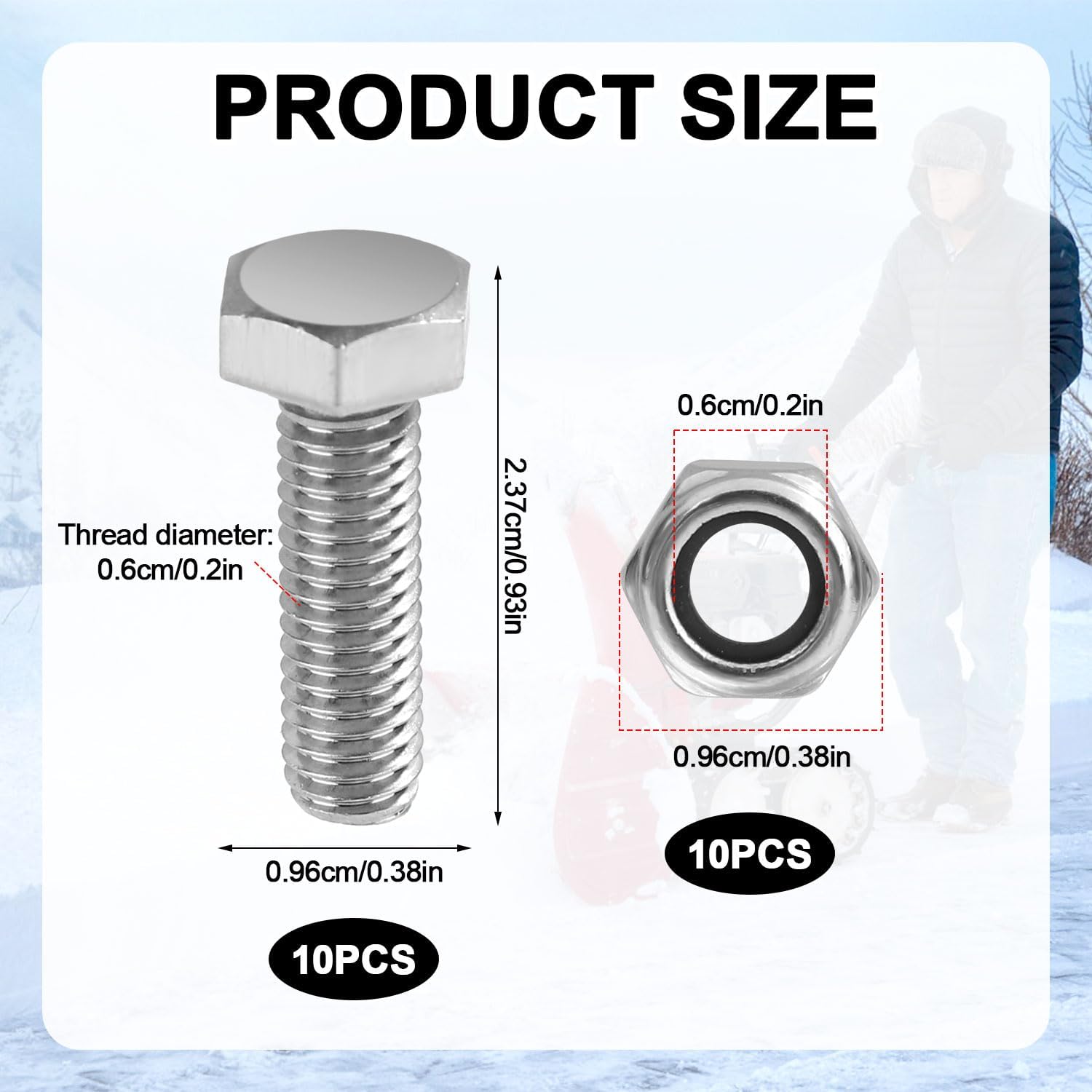 Specification: Color: silver Material: stainless steel Product Size: bolt: 2.37x0.96cm/0.93x0.38in, inner diameter 0.6cm/0.2in nut: outer diameter 0.96cm/0.38in, inner diameter 0.6cm/0.2in Package details: 10 x bolt 10 x nut Note: Due to manual measurement, the size and weight may have a certain error. Due to the difference between monitors, there may be a slight color difference existed.