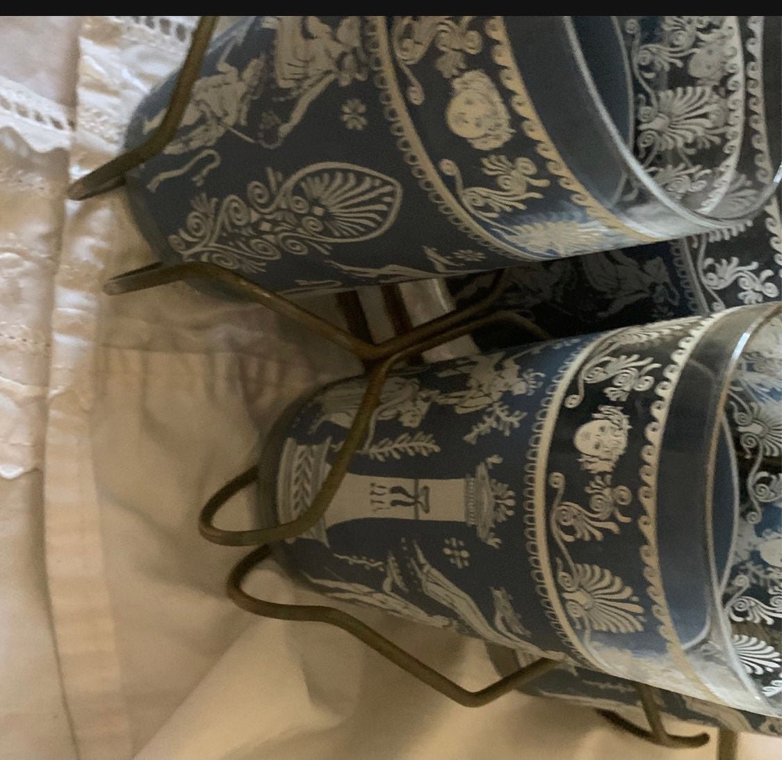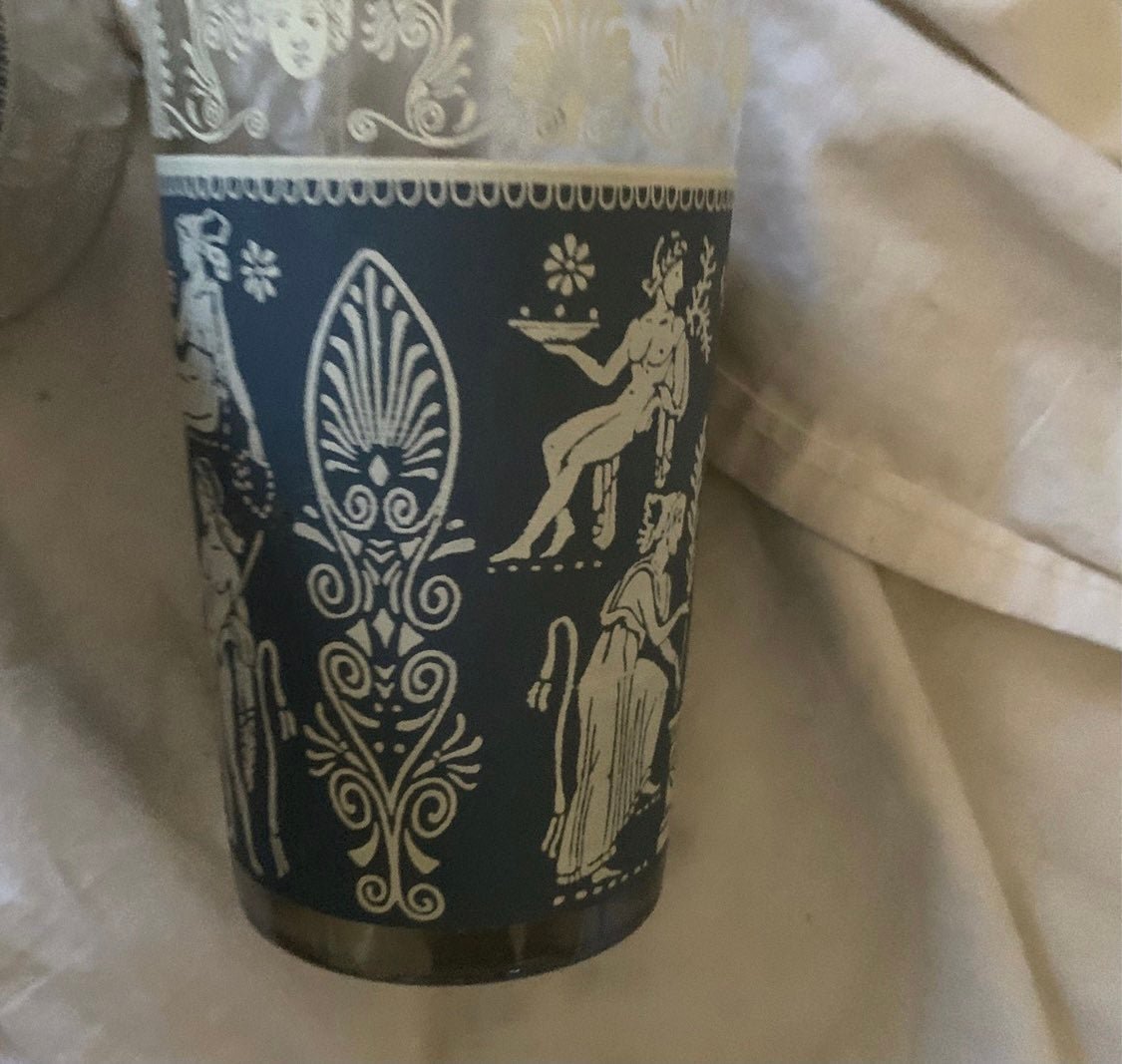 Vintage set of Greek design 5” glasses including original stand and ice bucket. Here we have a set of what I think are highball glasses. The stand is a Brass material I think and it shows its age I don’t know if it could be shined up. The glasses are in very good condition,no cracks. The ice bucket has gold around the perimeter but it shows its age. I believe this was a gift to my mother in the 1950s when she lived in New Jersey.