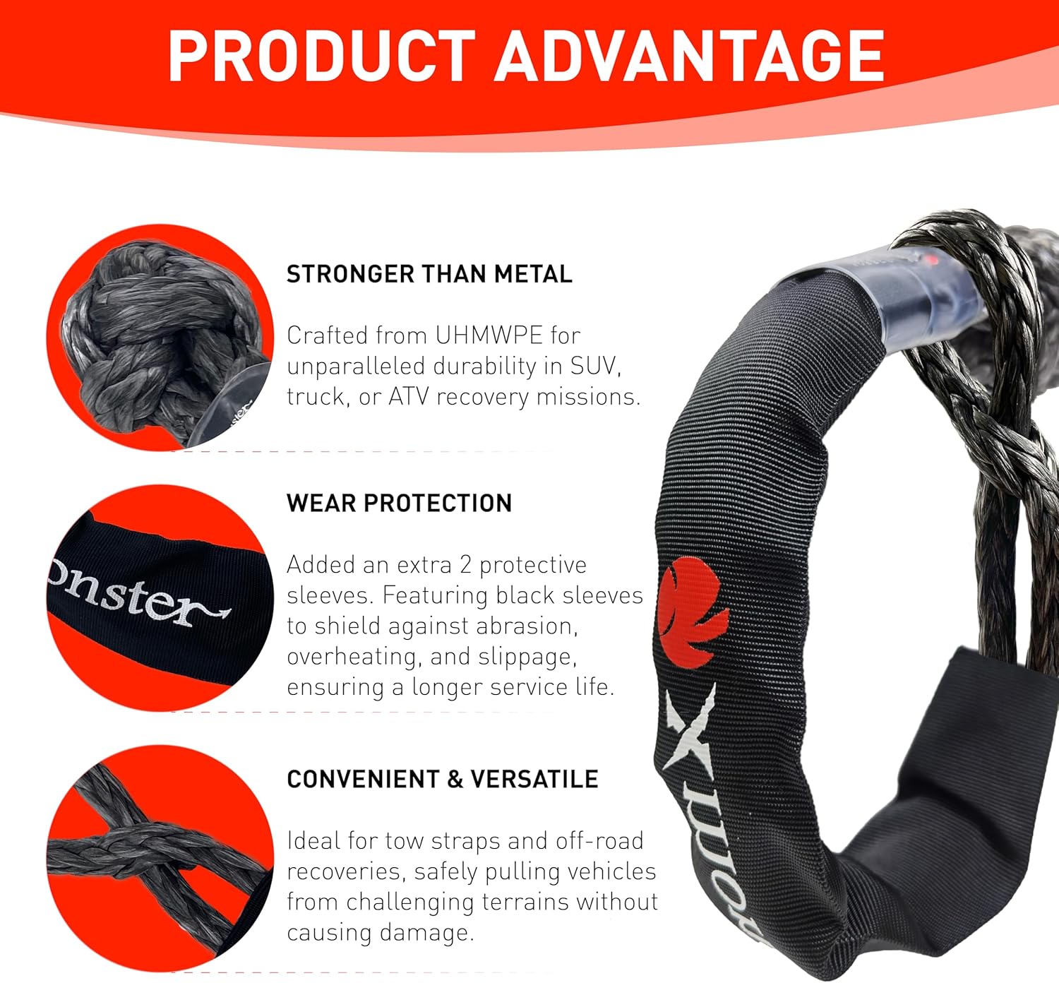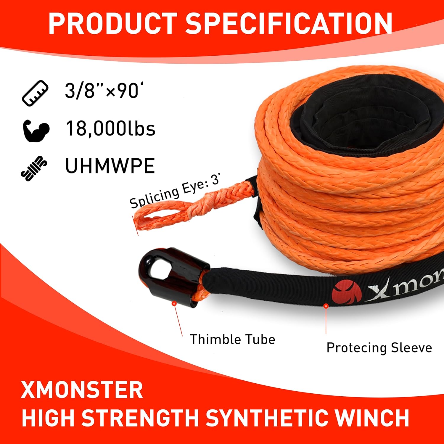 XMONSTER Synthetic Winch Line: The numerous advantages of synthetic winch lines made them an obvious choice for many off roaders. SAFETY Synthetic lines do not store energy while under load and are very lightweight. This means that if something should go wrong and the rope breaks, it will harmlessly fall to the ground. STRENGTH Synthetic winch lines have breaking strengths 30-90% higher than steel wire rope. WEIGHT Lighter than steel: 1/8 weight of the same size and strength off the drum easier than steel Specification: Size: 3/8" x 90', HMPE Synthetic rope ; Minimum breaking strength 18,000 lbs Color: Orange. Construction: 12 Strand HMPE Winch Rope, Black nylon sleeve and stainless steel thimble at one end, for better protection against abrasion ; Notice:Abrasion and sharp objects will shorten the life of your rope and must be avoided. Position the tubular abrasion protector on rocks, sand, or trees to guard against abrasion to the rope. IMPORTANT: THE DRUM AND FAIRLEAD MUST BE FREE OF ALL BURRS AND BE PERFECTLY SMOOTH. ANY IMPERFECTION IN THE DRUM SURFACE OR FAIRLEAD WILL CUT OR DAMAGE THE ROPE, RENDERING THE ROPE UNSAFE AND USELESS.