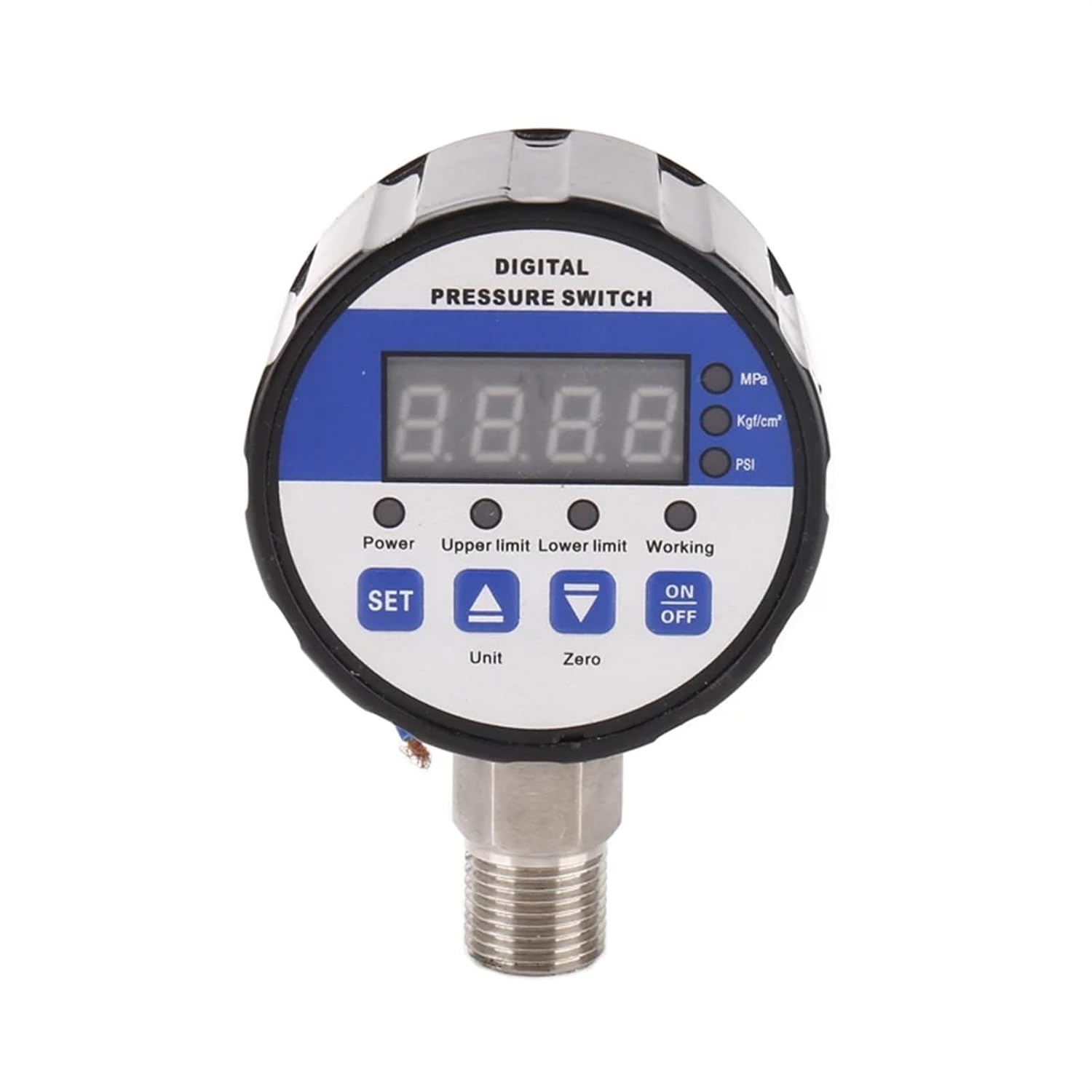 Compression GaugesDPR-S80 Digital Water Pump Air Compressor Pressure Switch 0-1 Mpa to 60 Mpa Pressure Control Switch 220VLED Digital Pressure SwitchDPR-S80 General typeFeatures-- 4 digital LED display pressure, Accuracy0.5%-- Three pressure units available ( Psi, Kg/cm2 , Mpa)-- Adjustable high & low pressure threshold and delay time- Adjustable control mode:normal control and reverse control-- Pressure leak and loss protection,secure setting-up-- Anti-electromagnetic interference design-- Zero clearing with one buttonProtective FunctionsUpper limit alarm(high pressure)Lower limit alarm(low pressure)Pressure leak alarmPressure loss alarm(no pressure)Typical ApplicationsMachine Automation Engineering MachineryElectromechanical Integration Equipment Pump&compressorHydraulic System Medical project Pipeline engineeringSpecificationPressure rangeGeneral type:0~1, 2, 3, 4, 5, 10, 20, 30, 40, 50, 60MpaMicro type:0~0.2, 0.5MpaNegative type: -0.1~0.1MpaPressure unitMPa,kgf/cm2,PSI adjustableOverload pressure150%Accuracy grade±0.5%FSPower supply24VDC,220VAC,380VACAlarm pointFull range can be setAlarm typerelay signalLoad capacity380V 3A,220V 5A,24V 5ASampling frequency10 times/secOperating temperature-20-80Compensation Temperature-10 ~60Measurement mediumAir,non-flammable&noncorrosive gas water oilcompatible with 304 stainless steelElectric protectionShortcircuit protection, reversepolarity protection, anti-electromagnetic interference designPressure connectorM20*1.5 G1/2,G1/4 (other connector could be )Connector material304SSOptional moduleRS485 Modbus Communication protocolDial diameter80mmShellmaterialABSMountingmethodsRadial directiononlyWeight0.4KgDimension==========Current : 5AMaterial : plasticSwitch Type : Pressure SwitchWarranty : 6 MONTHSModel Number : DPR-S80Item Type : SWITCHESPressure unit : MPa,kgf/cm ,PSI adjustablePower supply : 24VDC 220VAC 380VACPressure connector : M20*1.5,G1/2,G1/4,NPT1/4