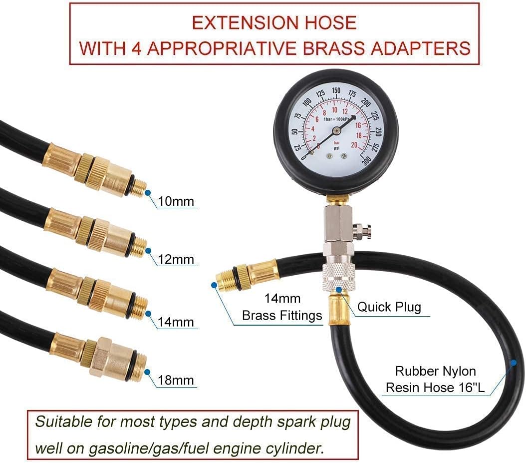 JIFETOR FUEL INJECTOR PRESSURE TESTER KIT APPLICATION RANGE 1. Fuel injection pressure is less than 140PSI: perfect for most gasoline/gas engine fuel injection system (except for Bosch, CIS Jetronic, Throttle Body Systems on GM vehicles), not for diesel high pressure injection pump or direct-injection engine. 2. Check if your vehicle's fuel pressure can be tested by one of following connection styles: Hook up fuel pressure test port directly 14"L long hose brass fittings is used for the 1/4" SAE standard schrader valve on the fuel rail or fuel pump. The 8"L short hose for M6 fuel pressure test port, and M8/M10/M12/M14 adapters for the corresponding test port on fuel rail In-line connection Aluminum tee with brass fittings allows to test the fuel pressure for most vehicles, by splicing in-line between the fuel pump and engine JIFETOR COMPRESSION TESTER SET WIDE USAGE AND FUNCTION JIFETOR engine cylinder compression tester set is perfect for checking compression pressure on most gasoline/gas/fuel engine cylinder, but not suitable for most diesel engine because of the low pressure range 0-300PSI Assist to diagnose following problems: Valve sticking Carbon build-up Cracked cylinder head or defective main gasket Poorly seated or worn piston rings Burned or damaged piston A variation in compression readings between cylinders is often a better indication of engine problems than the absolute values of compression NOTE 1.Please wear gloves and goggles when use 2.These tools should be used by professional or under the guidance of a professional 3.Always refer to the vehicle manufacturer's service instructions 4.Gasoline is highly flammable. Do not smoke, or test near open flames or a source of electrical sparks, or hot manifolds or other engine components