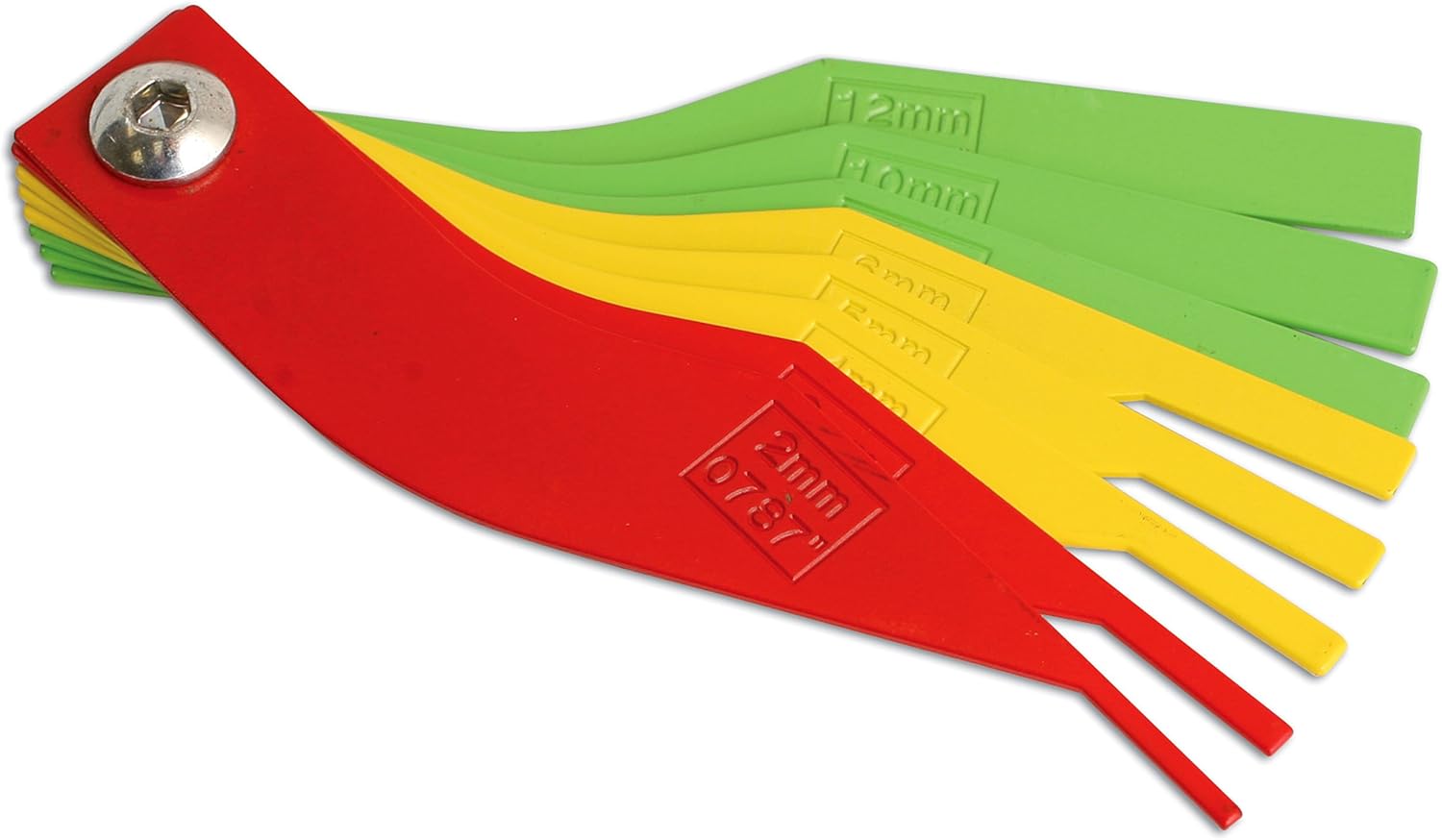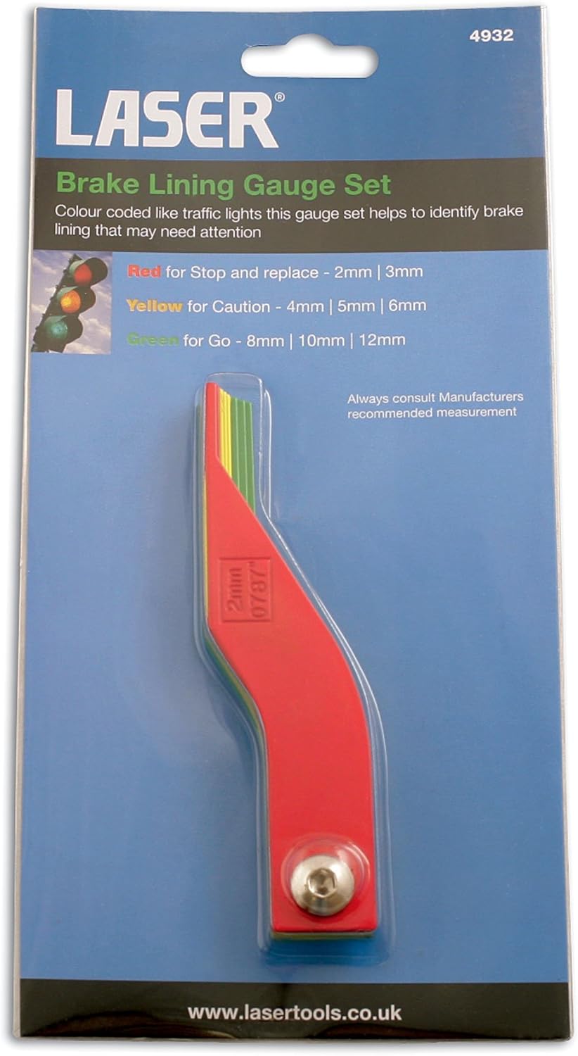 Colour coded like traffic lights this gauge set helps to identify brake linings that may need attention. Green for Go - 8mm 10mm 12mm. Yellow for Caution - 4mm 5mm 6mm. Red for Stop and replace - 2mm 3mm. Always consult Manufacturers recommended measurements.