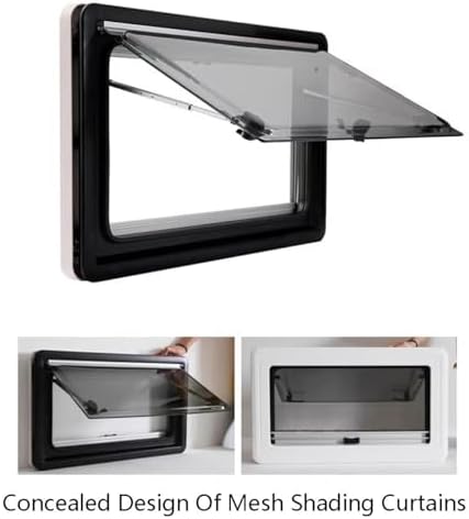 Elevate your RV experience with our premium RV Top Hinged Window, expertly crafted for both style and practicality. This window features a sophisticated black outer frame paired with a crisp white inner frame, enhancing the modern aesthetics of your RV or mobile home. Designed to fit wall thicknesses of 25-35mm, it provides versatility for various installations. The window boasts a cut-out installation size of 450*500mm (17.72*19.69in) and overall dimensions of 480*530mm (18.90*20.87in), with an opening size of 328*378mm (12.91*14.88in). Its thoughtful design includes a 7mm cut-out corner radius, ensuring a polished look. You can open the window up to a generous 70°, allowing for optimal ventilation tailored to your comfort. Enjoy a clean, unobtrusive interior with our innovative design that hides screws on the inner frame. The durable aluminum outer frame is paired with gray-tinted double-glazed acrylic panes that feature an integrated roller blind and fly screen, effectively blocking out sunlight while maintaining airflow. This window can be operated effortlessly with one hand, offering multiple push-out positions for adaptability based on weather conditions. Engineered for wall thicknesses between 25-35mm, our window's unique installation method can cut your setup time in half, saving you valuable time and labor costs. Each package includes one RV Top Hinged Window, making it the perfect upgrade for your mobile living space. Transform your RV into a comfortable haven with this stylish and functional window.