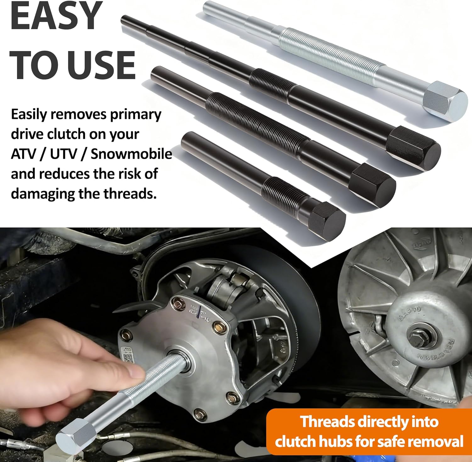• 【Easy To Use】: This kit is made of heavy duty forged steel for high strength and comes with matching thread design. Easily removes primary drive clutch on your ATV / UTV / Snowmobile and reduces the risk of damaging the threads. NOTE: Please verify your model and year before purchasing! Saves cost vs. buying individual tools.