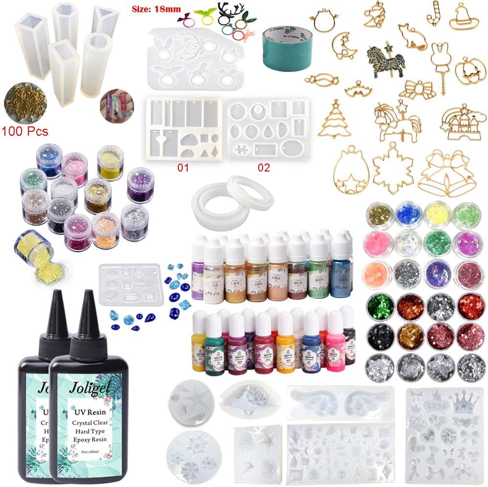 Package includes: 2x UV resin (Net: 100ml) 36x Decorations 13x Liquid pigment (normal solid colors) 15x Liquid pigment (pearlescent / metallic colors) UV Curable Crystal Clear Transparent Epoxy Resin More convenient: It can be used immediately, no need to do the proportion and mix. Faster: It solidifies within 5-30 minutes (depending on the quantity) with the UV lamp (they serve as manicures). The resins of two components, on the contrary, usually need 24-48 hours to stay solid. More stable: High yellowish resistance, neither cracks nor yellows with time. How to use the resin: 1. First we need a jewellery mould and our resin, you can add other accessories such as beads or glitter if you want. 2. Squeeze the bottle gently to let out the resin and deposit the amount that we need in the mould. If you want to mix beads / glitter, you can first mix them with the resin before putting it into the mould (only when the beads / glitter are very small), or use the tweezers to place them right after you have added the resin into the mould. 3. Dry the resin with the UV lamp for 2-4 minutes (if we are doing small pieces like rings). 4. Take out the result from the mould. How to avoid bubbles: 1. Before using the resin, place it upside down to prevent air bubbles from escaping during extrusion. 2. Use a toothpick to concentrate the air bubbles on the surface of the resin. Puncture them with a pin or undo them by applying heat with a heat gun or a lighter.