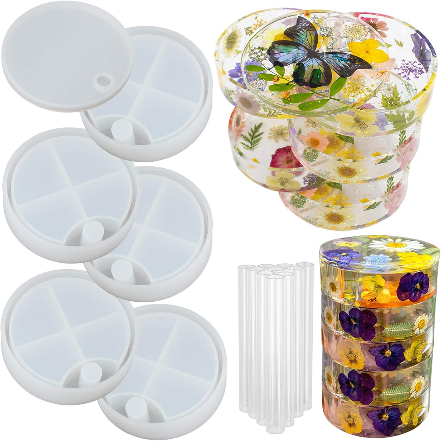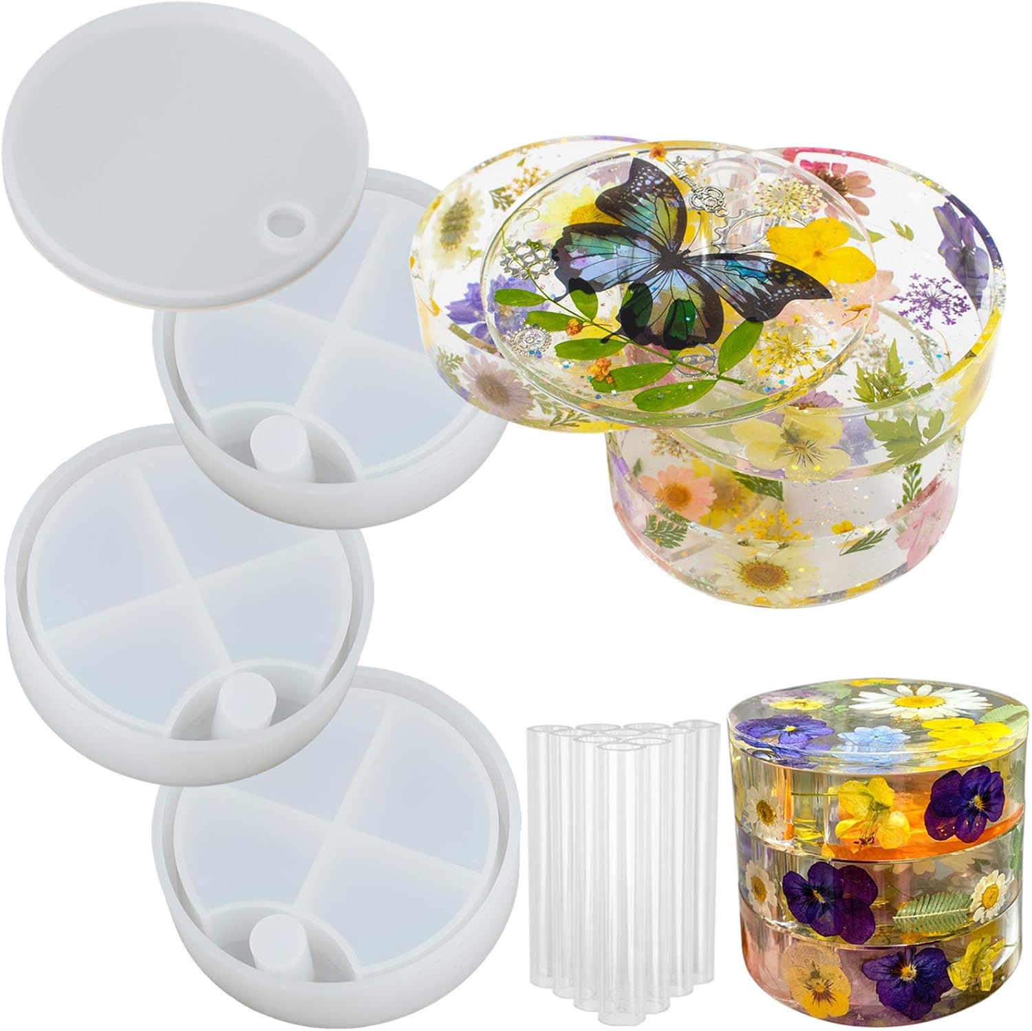• Multi-layer trinket box casting molds set, includes 6 round trinket box molds (9.6x9.6x2.5cm); 1 cover mold; 40 plastic sticks, height around 14.5cm. Make 6 tiers jewelry organizer at the same time.