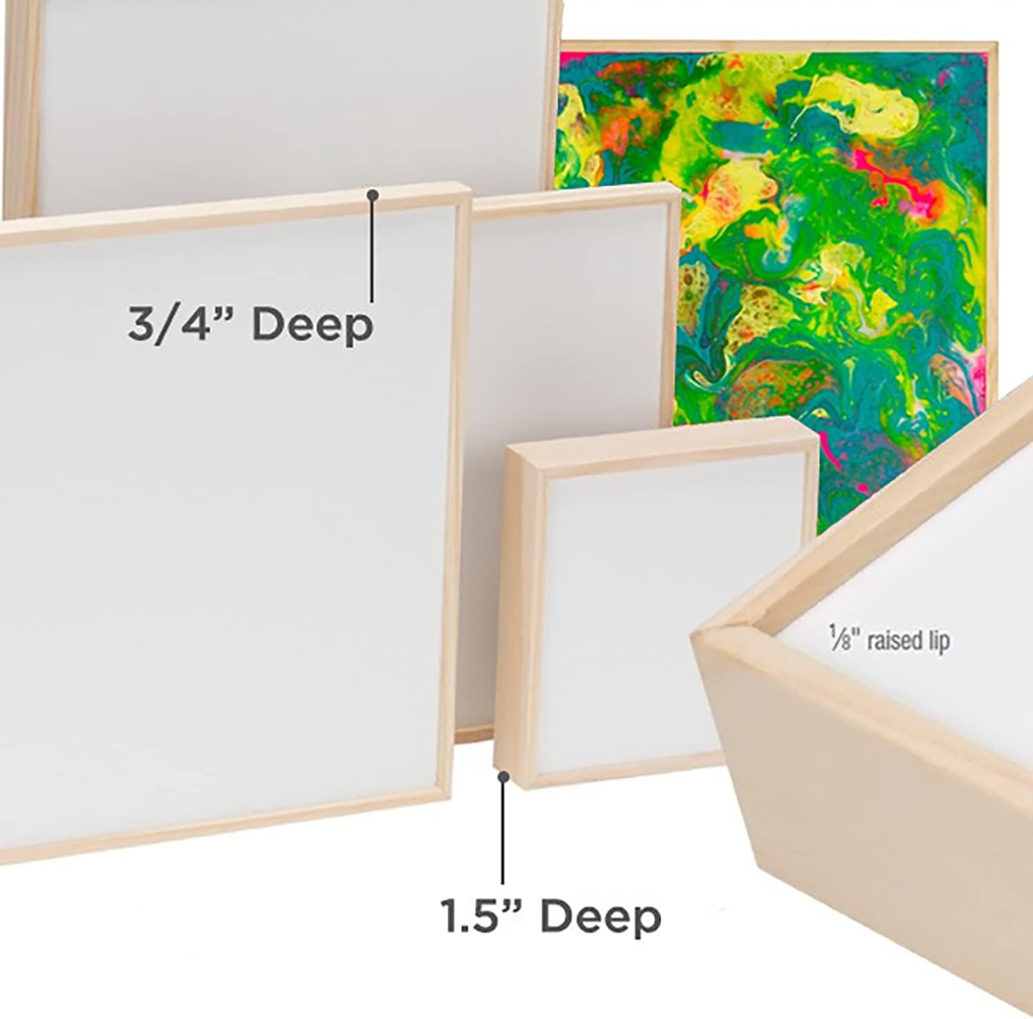 These gesso panels feature a 1/8" raised lip which is part of the frame around the panel itself. The Natural Wood can be left as-is or stained and Painted for frameless Presentations. Use with Fluid Acrylics, High Flow Acrylics, Glazing liquids, Pouring Mediums, Encaustics, Pebeo Resin Paints and Alcohol-based dyes. Available in several Sizes, with a choice of 3/4" or 1.5" depth.