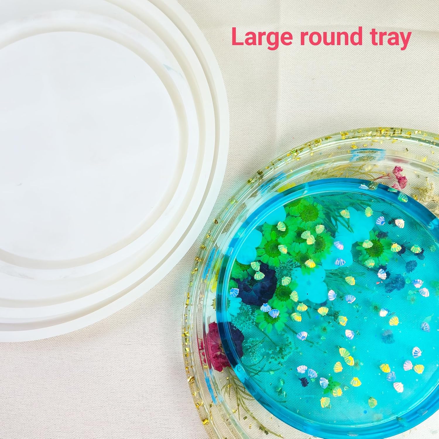 Transform your crafting projects with this versatile 3-piece round resin casting mold set. Perfect for creating stunning serving trays, decorative plates, and organizational solutions, these silicone molds come in three convenient sizes ranging from 7 to 12.6 inches in diameter. The set includes small (7.68"), medium (10.47"), and large (12.6") molds, each featuring a smooth surface for flawless results. These durable molds are ideal for casting epoxy resin pieces like jewelry display trays, trinket dishes, coasters, and decorative plates. The shallow depth of approximately 0.8 inches makes them perfect for practical items. Each mold is precisely engineered with detailed dimensions and varying weights from 4.8 to 11.49 ounces, ensuring stability during the casting process. Whether you're organizing jewelry, displaying snacks, or creating custom home decor, these professional-quality molds deliver consistent, beautiful results. Suitable for both beginners and experienced crafters looking to expand their resin casting capabilities.