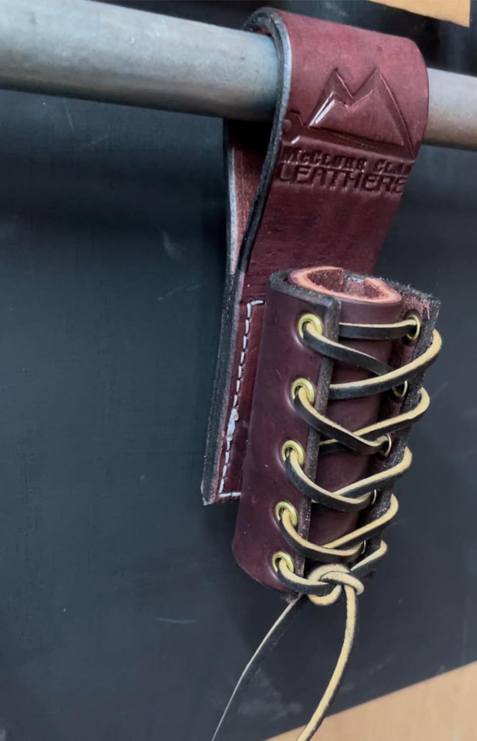 The Str8 Razr Sleever Bar Holder is built to hold your sleever bar in a vertical position. It has an adjustable lace to make sure your sleever bar is secure. This is a small and compact holder, great for any ironworker. Will fit up to a 3″ belt. Check out the Washer/Grommet set to make your belt compete. Made from 10-12 oz. Latigo leather Leather is double layered and glued Stitched together with heavy duty 207 thread Has ten plated eyelets for the leather lacing to slide through Has a leather insert so that your bar does not hang up on the laces upon insertion Leather color may vary slightly from pictures Tools not included