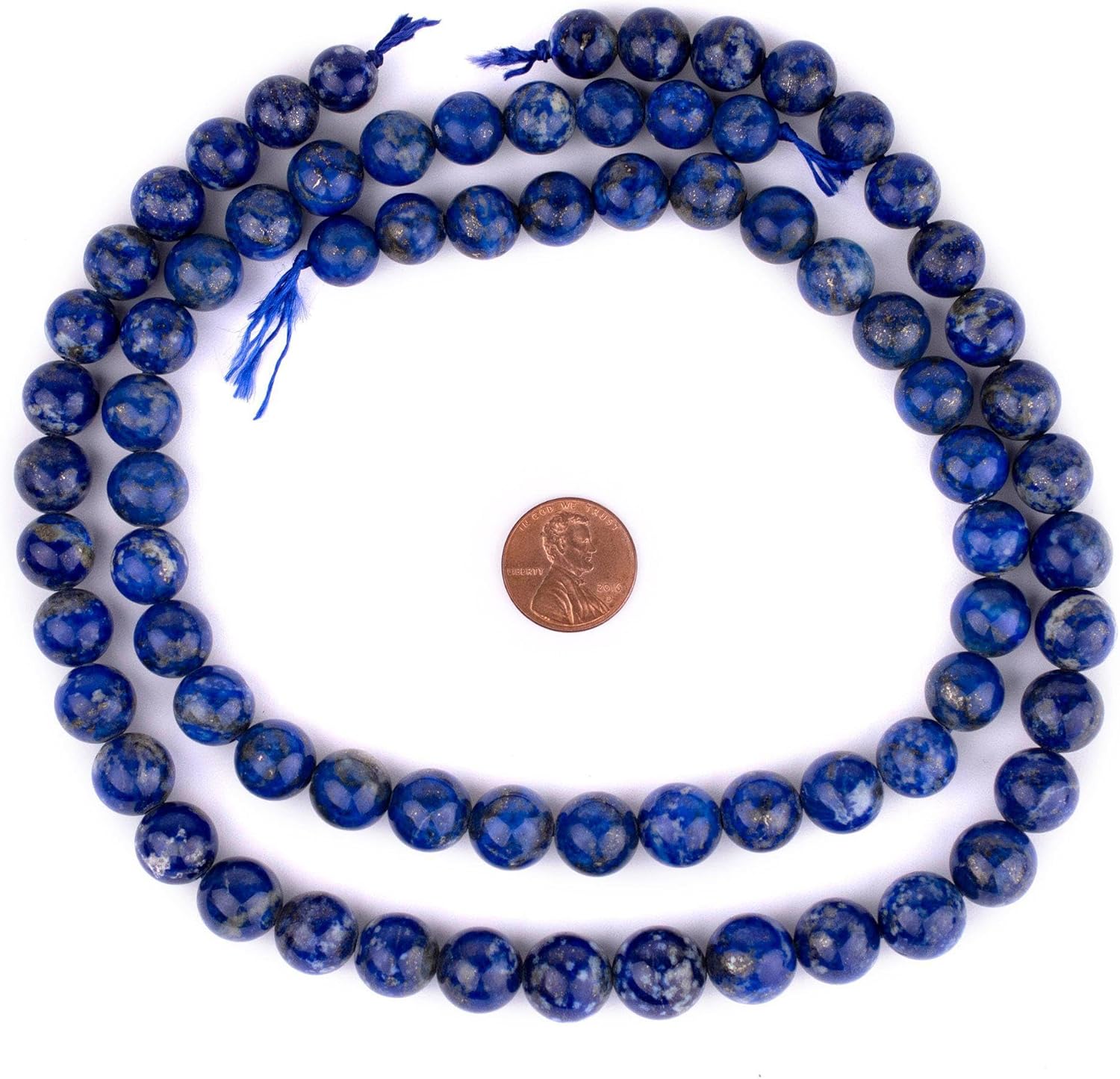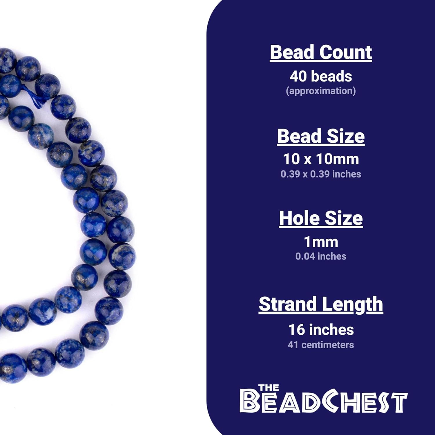 Take a dive into the deep blue tones of these alluring Lapis Lazuli Beads. Lapis Lazuli Beads are known for their vibrant blue hue and inspiring naturally occurring patterns. Many believe that Lapis Lazuli beads have a positive healing energy about them. It is said that Lapis Lazuli beads when worn can help one focus better. These Lapis beads also make for a great accent piece on most necklace and bracelet designs. Lapis beads even look great when worn as is as a simple necklace. Each artisan Lapis Lazuli bead strand is about 16" in length. Each handcrafted bead is 10mm in diameter and roughly has a 1mm bead stringing hole. Shade of blue may vary from photo. Some strands may be slightly graduated. Multiple strands may be pictured. Each strand sold individually. Please note: these lapis beads are higher quality and the stone is sourced directly from Afghanistan. Spice up your jewelry designs with Lapis Lazuli Stone Beads today! Please note: a large majority of The Bead Chest products are handmade. Therefore, the tone, brightness, and/or color of the product received may vary from the photo. Additionally, any sizes and/or bead counts mentioned are approximations and may vary up to 10-15% from the stated number.