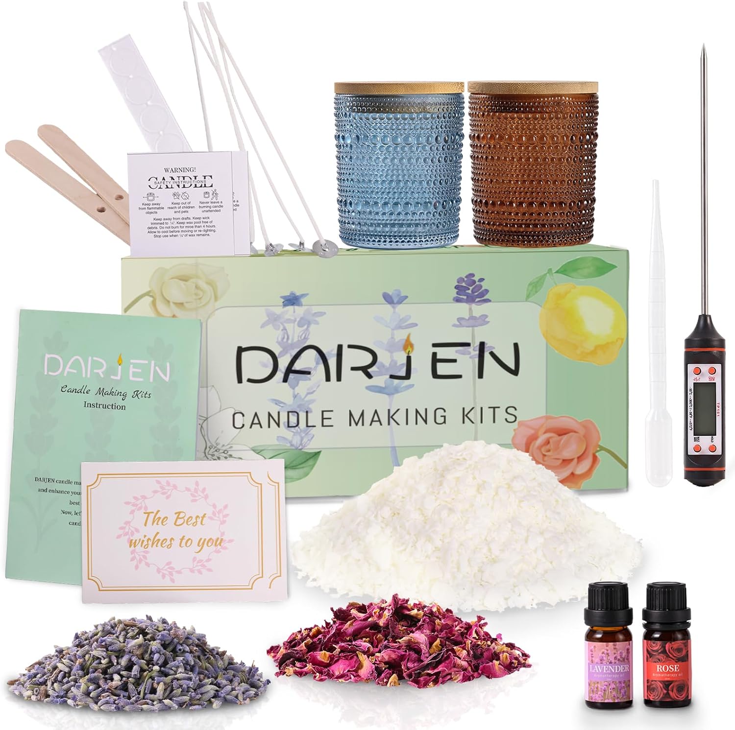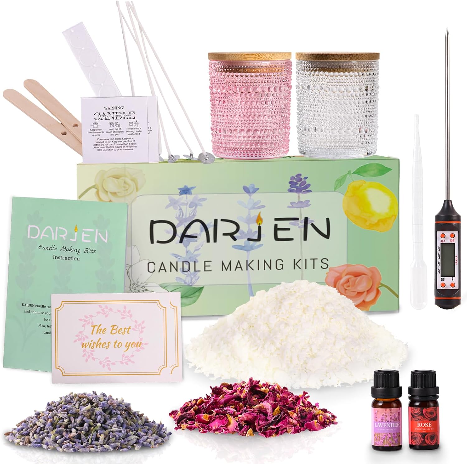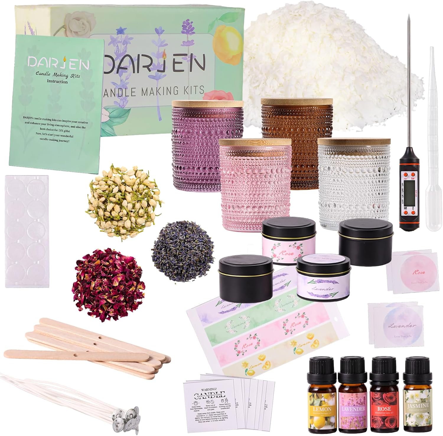 | Included Components | 2.5lb soy wax, 8oz candle jars (Clear, Pink, Blue, Green), 4oz candle tins, dried flowers, candle wicks, glue dots, wooden center devices, fragrance oil, dropper, thermometer, warning sticker, stickers, instruction |