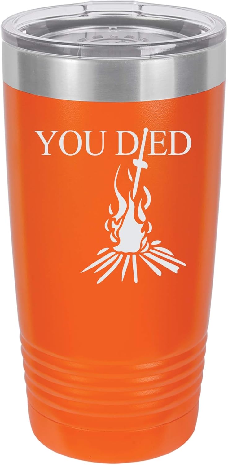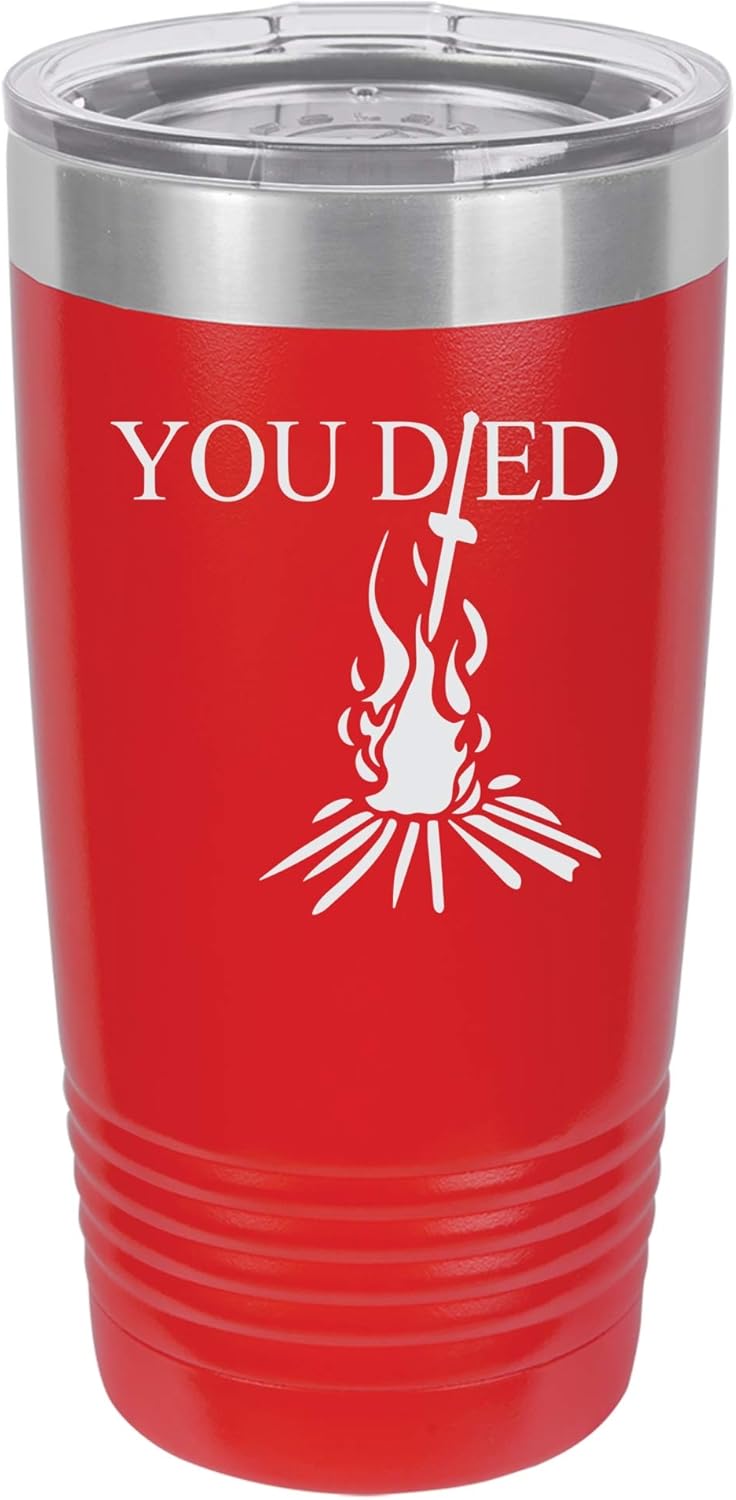 Enjoy your beverage at home or on the go with a wonderfully designed 20 oz. travel tumbler. Made of stainless steel, this tumbler is vacuum insulated to maintain the temperature of your drink for an extended period of time. Can be used for hot drinks and cold drinks or as a thermos. The tumbler measures 3 and 3/8" in diameter and 6 and 7/8" tall. Fits perfectly with most standard size cup holders. This tumbler is not dishwasher or microwave safe. Kindle a fire and replenish your core with a beautifully drawn video game inspired design. Share the lore, the passion and the love of your favorite video game and carry it wherever you go. A Perfect Companion for the Lore Lover. A Perfect Design for the He That Bears The Curse. A Perfect Gift for The One Made of Ash. Gear up, spend your souls and enjoy.