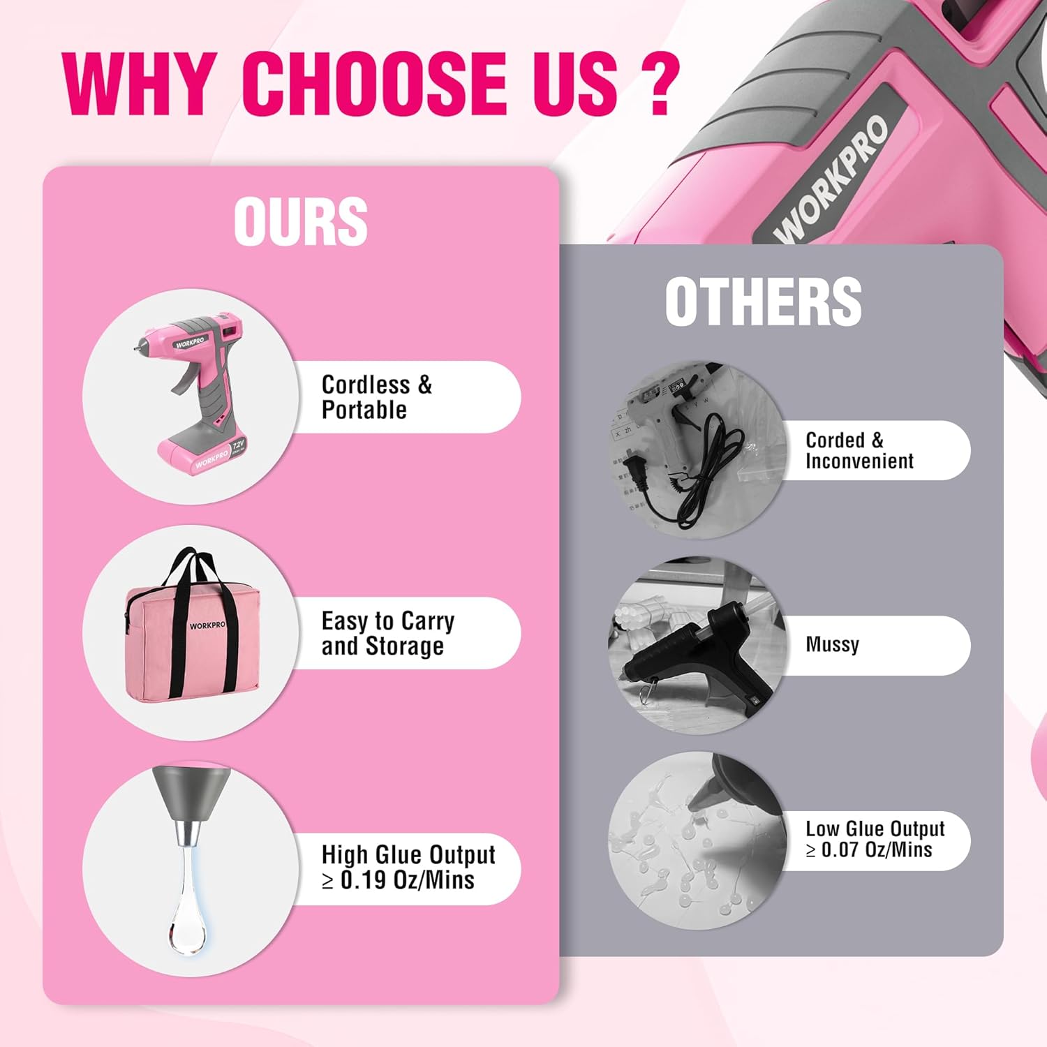 WORKPRO Cordless Hot Glue Gun, 7.2V Glue Gun with 50 Pcs Premium Mini Glue Sticks and Storage Bag, 2600mAh Type-C Rechargeable, Dual-Temp Hot Glue Gun Kit for DIY, Crafting and Arts