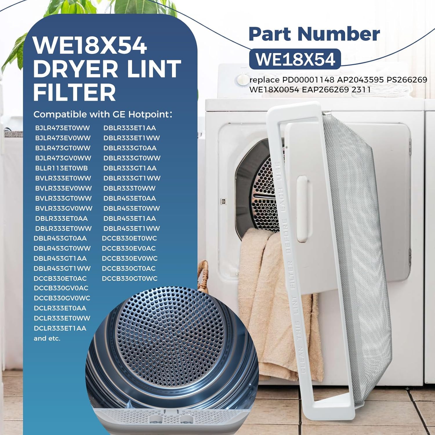 This lint filter effectively captures lint, debris, and fibers from clothing during the drying process, preventing them from accumulating in the dryer's exhaust system and ensuring safe and efficient dryer operation. Part Number: WE18X54 replace PD00001148 AP2043595 PS266269 WE18X0054 EAP266269 2311 Type: Dryer Lint Filter Purpose: Captures lint and debris in the dryer during the drying process Compatible Models: for GE and Hotpoint dryers Function: Prevents lint buildup in the exhaust system, ensuring efficient and safe dryer operation Fitments: WE18X54 lint fits for BJLR473GV0WW BVLR333ET0WW DBLR333ET1AA DBLR453GT0WW DCCB330EV0AC DCLR333ET0WW DDC5000SCLWH DDC5400SDLAD DDC6400SBLWH DDE4107SBLWH DDE7000SBLAA DDE7109SBLWW DDE7905SBLAA DDG5180SBLWW DDG7087SBLAA DDG7280SBLWH DLLR113ET1WB DRB4600SBLWW DRL4480SBLWW DVLR223ET1WW DVLR223GV0AA DWLR473ET0WB DWLR473GT1AA SIG7010ET1WG DLB3200SBLWH DLB3800SBLWW DLL3680SBLAD NJLR473EV0WW NLLR113ET1WO NVLR333GT0WB, etc