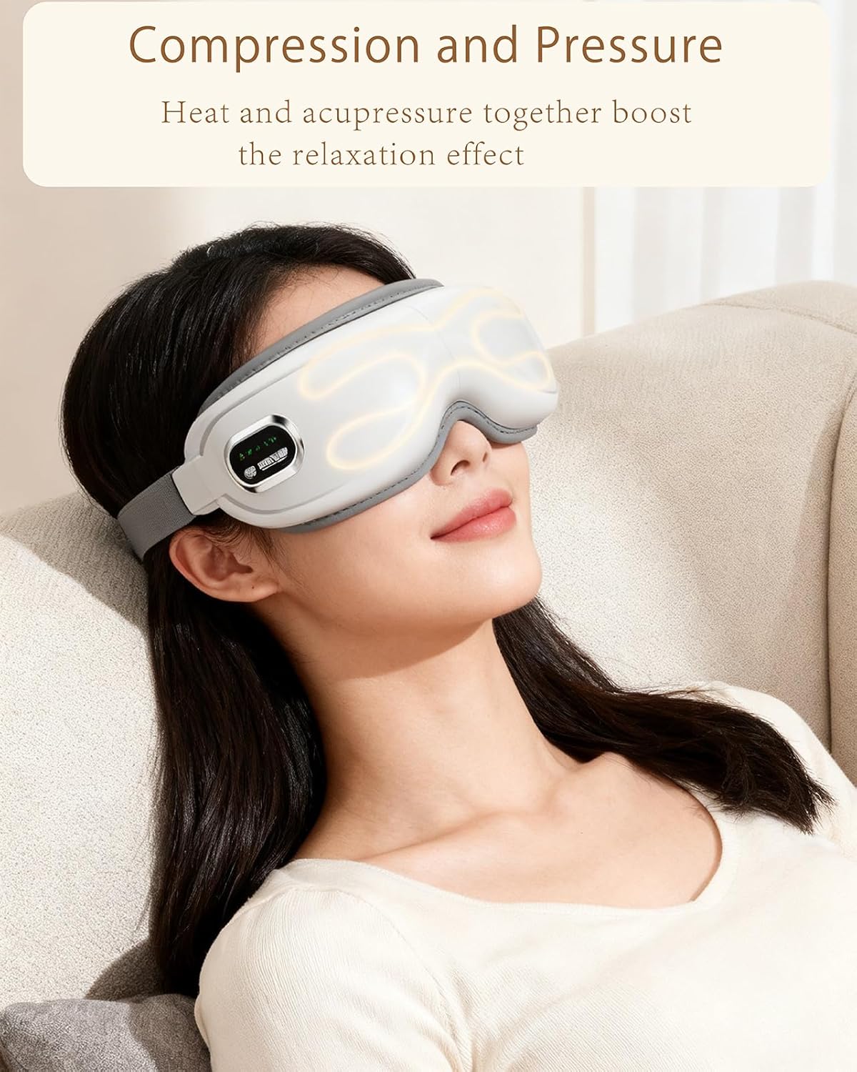 • Upgrade Double Layer Design for Superior Eye Massage Our heated eye massager for migraine is constructed with a double layer massage pad, whose details are redefined to create a new class of eye touch massager by reducing the pressure directly applied on the eyeballs. Wear the eye mask massager for just 15 minutes before going to bed every night and you will feel completely relaxed, enjoying a deeper, more restful sleep