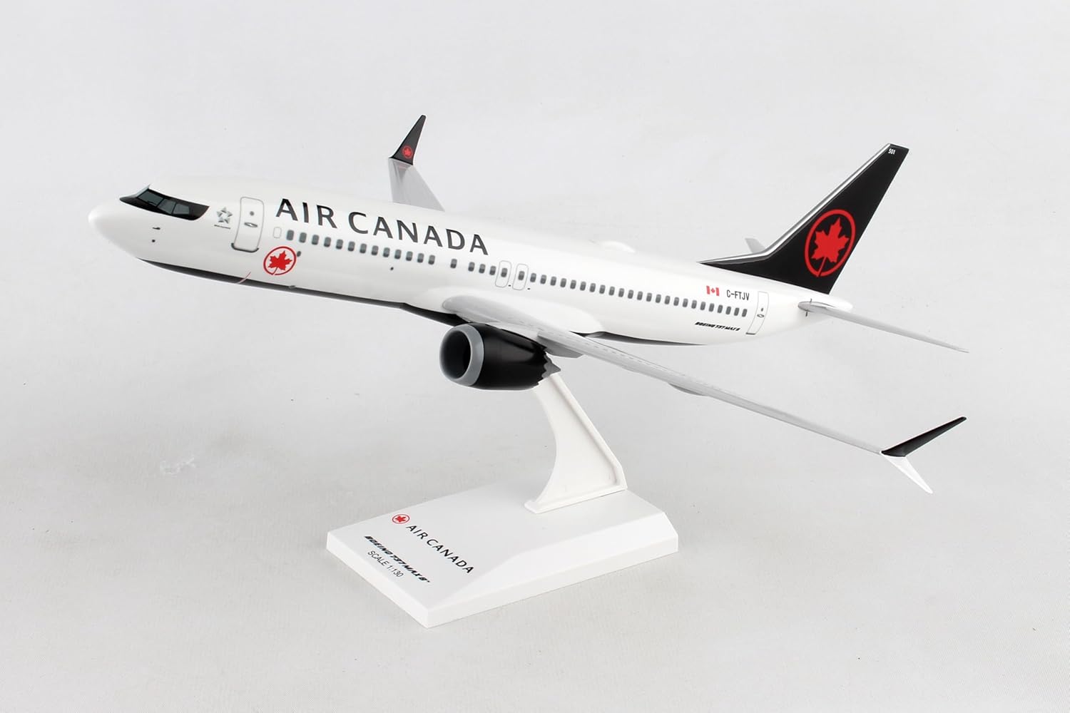 Comprising high-quality, solid, and substantial injection-molded plastic components, the SkyMarks 1/130 Scale Air Canada Boeing 737 MAX 8 with Wi-Fi Dome features a simple snap-fit design that allows for easy assembly without the need for glue. The model measures approximately 11-7/8 inches in length with an 11-3/16-inch wingspan and comes complete with a display stand. An accurate, true-to-scale reproduction of the actual aircraft, this model is ideal for collectors and showcases authentic, highly detailed graphics and markings. Having entered service in 2017 as the fourth generation of the Boeing 737, the 737 MAX is a twin-engine, narrow-body airliner designed to succeed the Boeing 737 Next Generation series and to compete with the Airbus A320neo family. It offers several significant improvements over earlier variants, including more efficient engines, a fly-by-wire system, enhanced cockpit features, improved aerodynamics, and increased range. The 737 MAX 8 can be configured to seat up to 200 passengers and directly replaces the third-generation Boeing 737-800. This Air Canada version sports the airline’s new livery, featuring a primarily white fuselage with a black cockpit window mask, black “Air Canada” lettering, and a black underside and tail emblazoned with the airline’s red maple leaf logo.