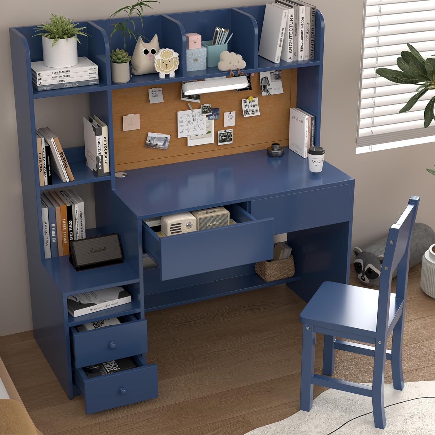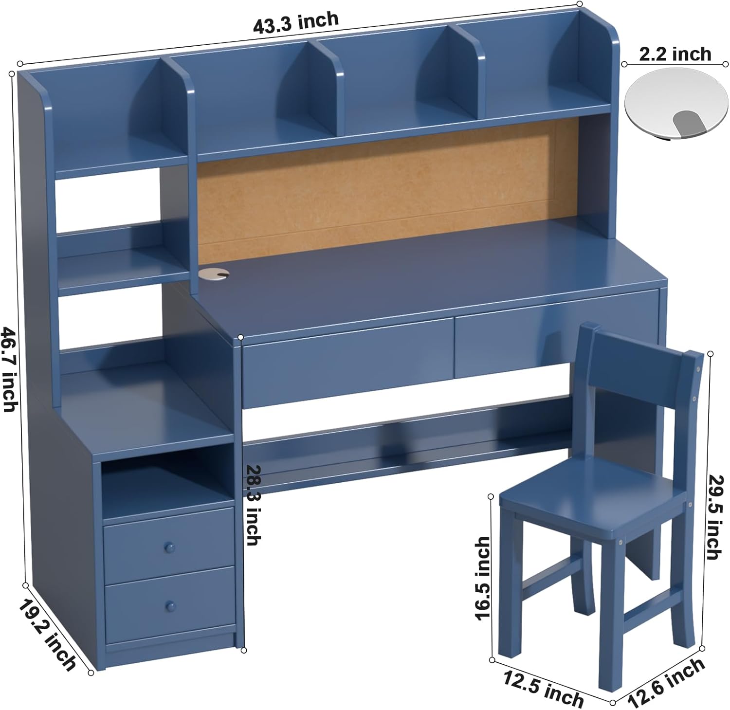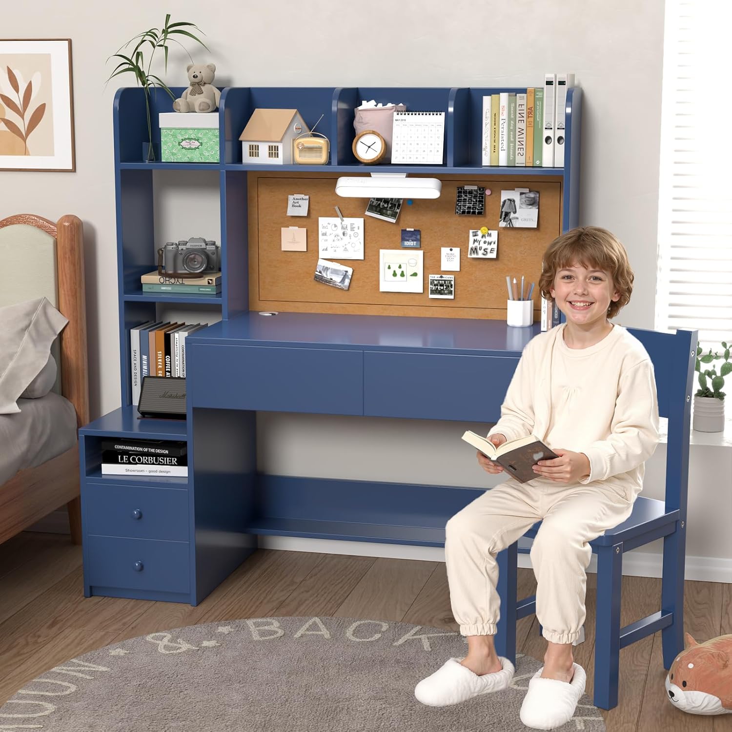 Blue Wooden Kids Study Desk and Chair Set, Childrens Desk with Light, 4 Drawers,Storage Cabinets and 4 Storage Open Shelves, Boys & Girls Study Desk for Bedroom and Kidsroom