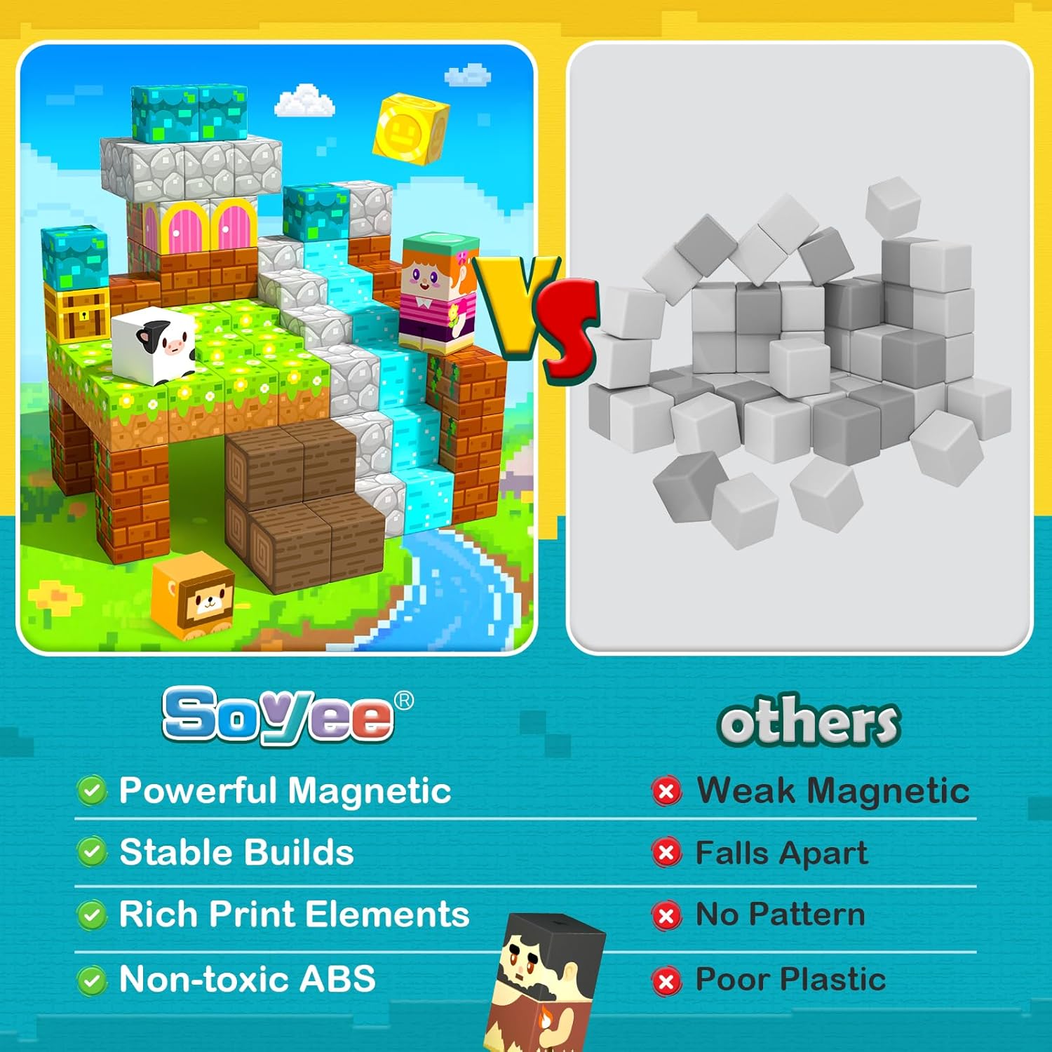 • POWERFUL MAGNETISM, EASY TO BUILD: Soyee magnetic blocks(2cm) have powerful magnetism. Blocks don’t fall apart easily. Kids can build any shapes, simple or complex, as they like. Magnetic tile is certified by CPSIA and ASTM, made of high-quality ABS material, with smooth and rounded edges to protect kids' curious hands, and the sealing technology ensures that the magnets will not fall out easily. It is recommended for boys & girls ages 3+