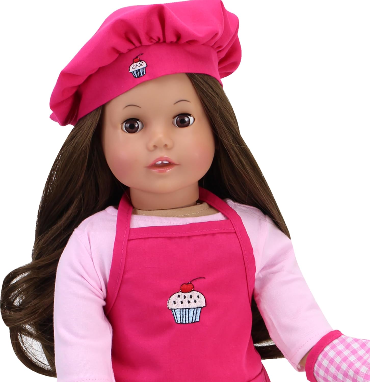 Let’s get cooking… or baking for that matter! This chef accessory outfit set allows your little one and their doll to whip up cupcakes, brownies, or any other tasty treat while keeping their clothes clean and looking absolutely fabulous. The embroidered cupcakes on the apron and baker’s hat are beyond cute, and the hot pink trim on the light pink gingham oven mitts perfectly matches the rest of the set, tying the look together. A large front pocket keeps doll cooking tools close at hand. Perfectly styled to fit Sophia's dolls and other 18" dolls from most leading brands (doll not included). Sophia's brings to life the magic friendship between a kid and dolls through beautifully made dolls, doll furniture, and doll accessories.