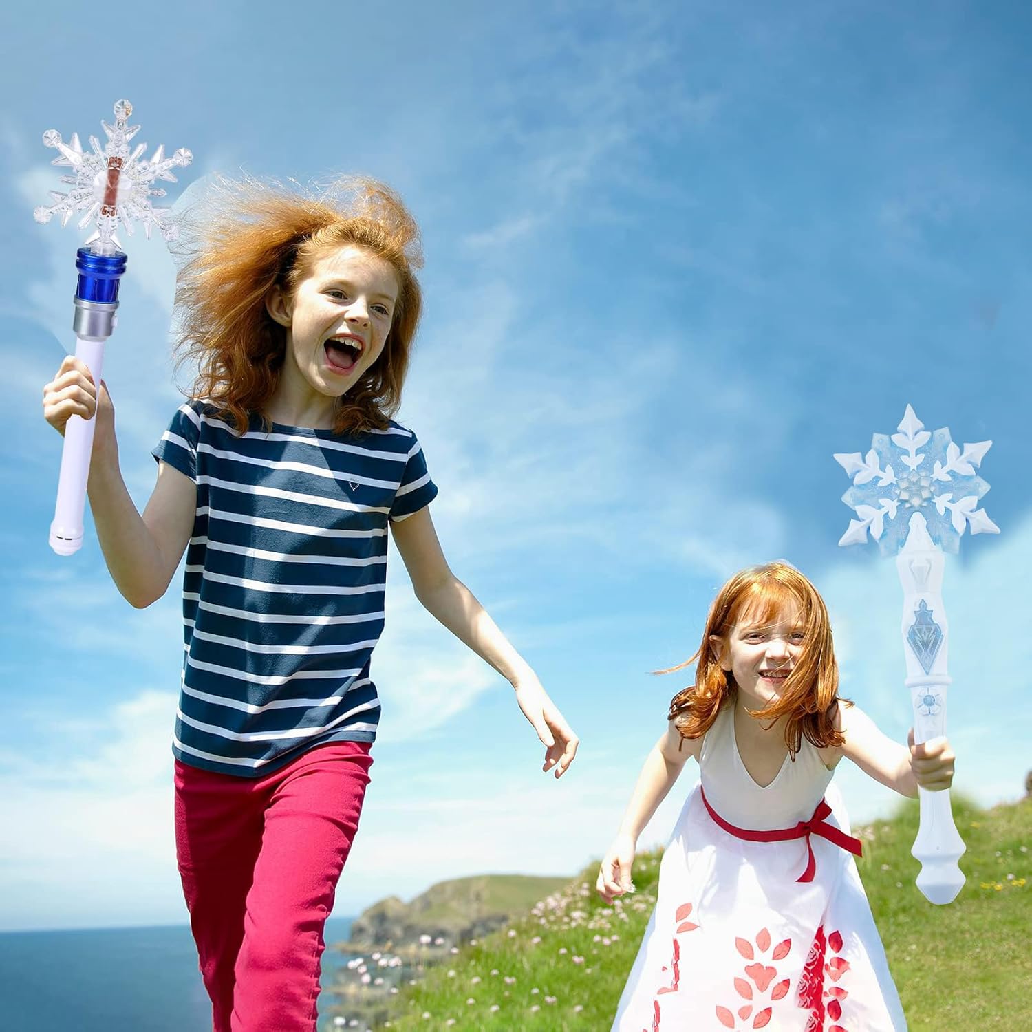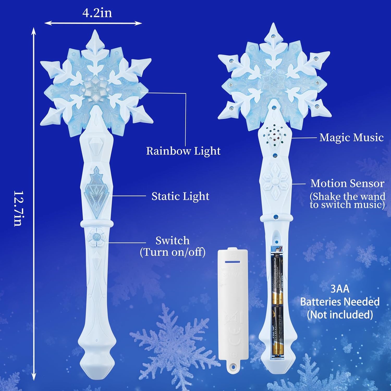 Products include: 1 x Sensor Magic Princess Toy Wand, 1 x Snowflake Spinning Wand Size: The length of the sensing magic princess toy wand is approximately 12.58 inches The Snowflake Whirling Wand is approximately 14.5 inches in length The snowflake magic wand will become your child's new favorite. Winter Wonderland, and Princess of the Wand. The length of the wand is very suitable for young children. It is well-made, high-quality, very sturdy, and can be played for a long time. It is the perfect toy for any kid who likes to pretend to be a princess.