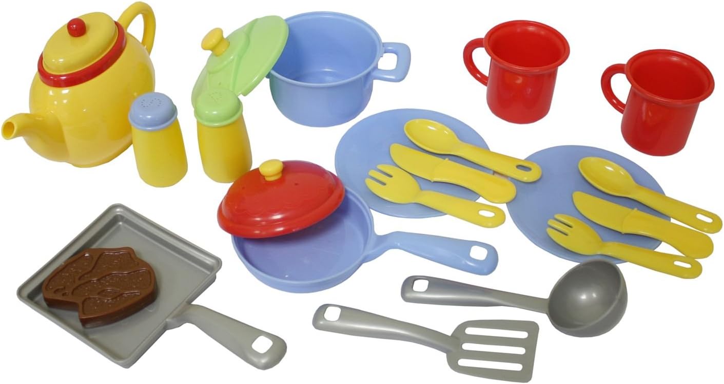 With this beautiful breakfast set, the play kitchen is complete. The set includes two knives, forks, spoons, plates and cups, as well as a pot and a pan with lid and a pan without lid. The set is rounded off by a teapot, a salt and pepper shaker, a spatula, a soup ladle and a steak.