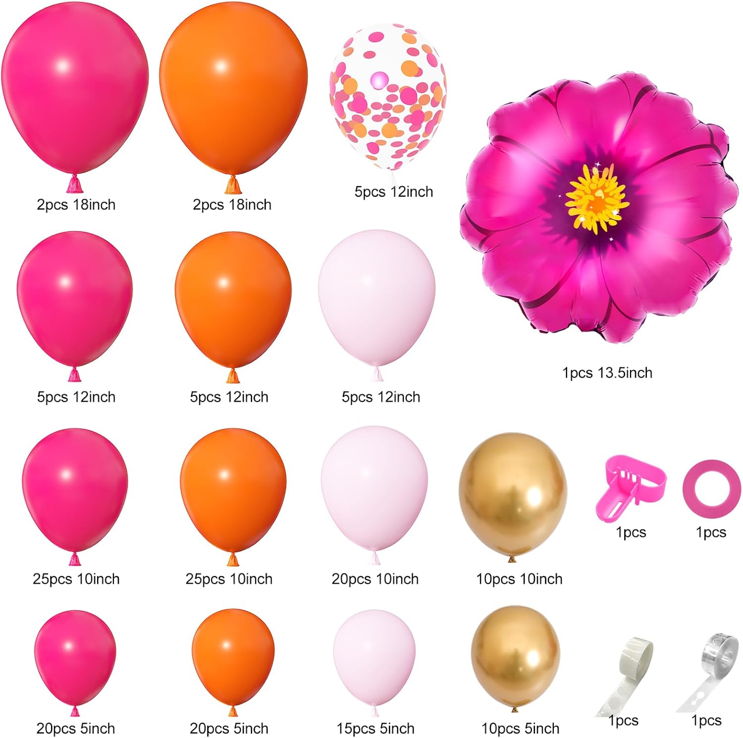 Elevate your celebrations with our hot pink and orange balloons kit, designed to create a stunning balloon arch that will impress your guests. This comprehensive set includes 175 high quality balloons in various sizes—18inch latex balloons, confetti balloons, 12inch, 10inch, 5inch balloons, and a charming sunflower rose aluminum film balloon, along with four essential tools for easy assembly. It’s the perfect choice for those looking to add a vibrant touch to any event.💖🎈