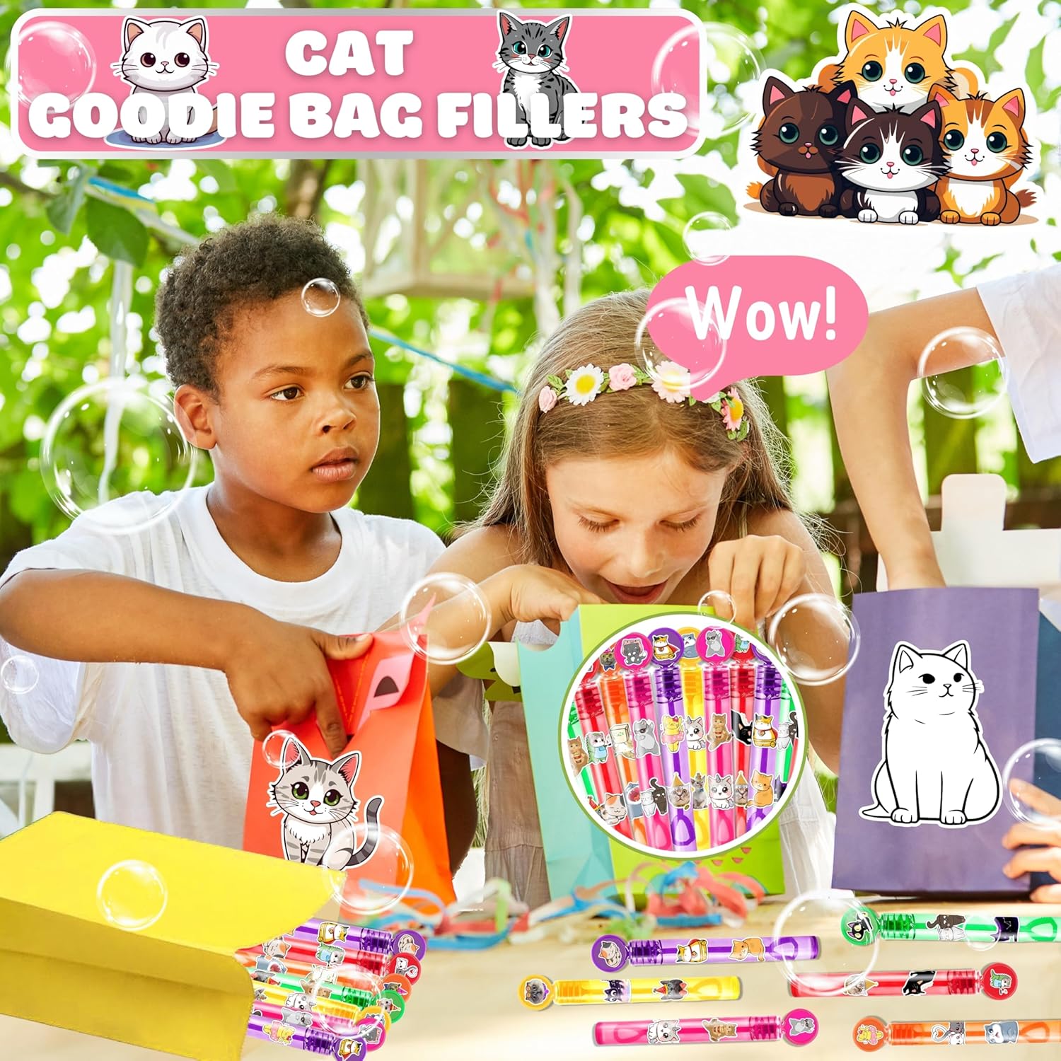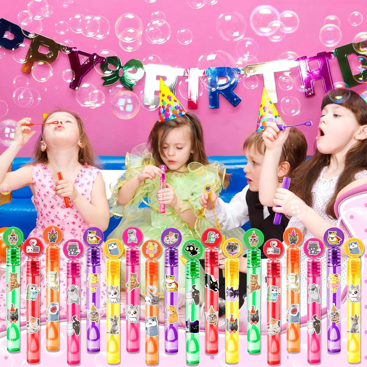 CAT PARTY FAVORS: Create joyful moments with this set of 24 cat themed bubble wands designed with cute kittens playful paw prints and bright cheerful colors. Perfect for cat birthday parties classroom celebrations and kids events PERFECT GOODIE BAG FILLERS: These mini bubble wands fit perfectly into cat themed goodie bags classroom reward boxes party favor sets and treat bags. A fun and interactive gift kids will enjoy CUTE CAT THEME DESIGN: Each bubble wand features adorable cat and kitten inspired designs making them ideal for pet themed parties playdates and celebrations for boys and girls SAFE AND DURABLE MATERIAL: Made from child safe durable plastic with leak resistant design suitable for indoor and outdoor cat themed celebrations READY TO GIFT PARTY SUPPLIES: No assembly needed. These bubble wands are ready to use and help parents and teachers prepare cat themed events quickly and stress free DEDICATED CUSTOMER SUPPORT: Have any questions? Our friendly team is here to make your cat celebration full of excitement and smiles!