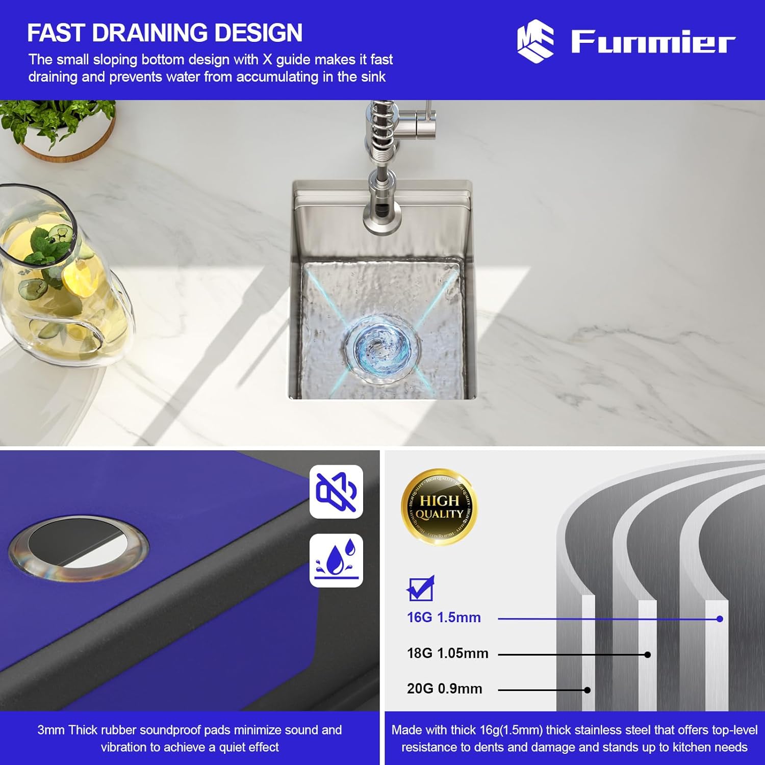 | Included Components | 1 Pc Bottom Grid & Rollup rack & Cutting Board, 1 pc Drain Aassembly, 12x15 inch deep bar sink, Instruction & Template & Clips |