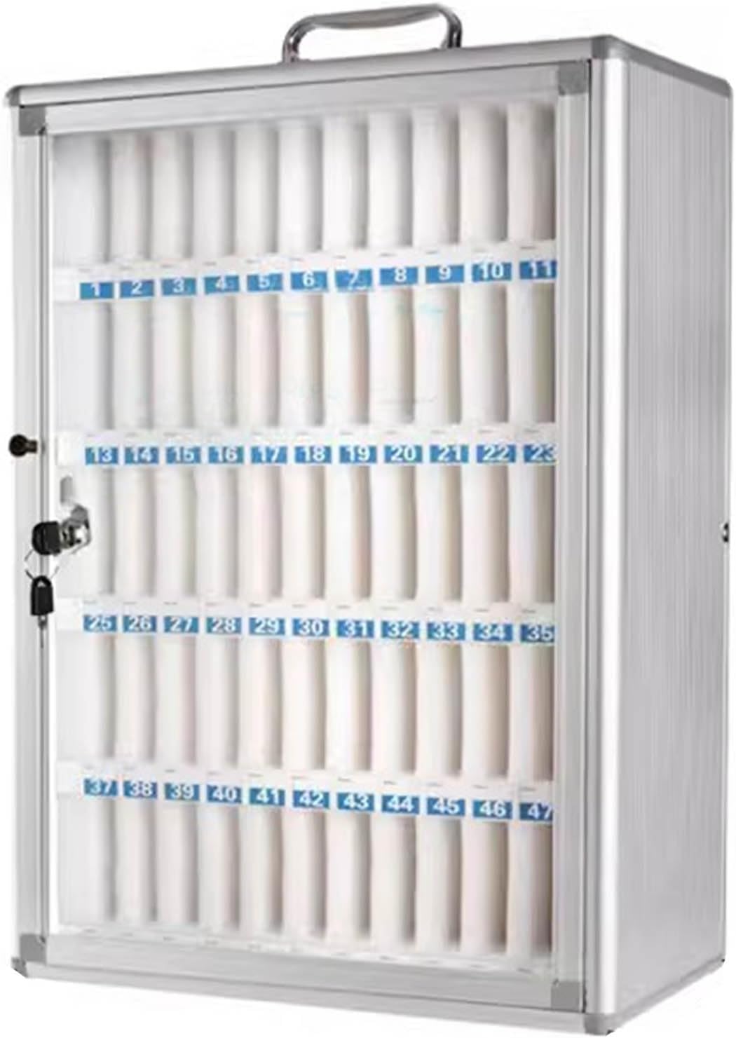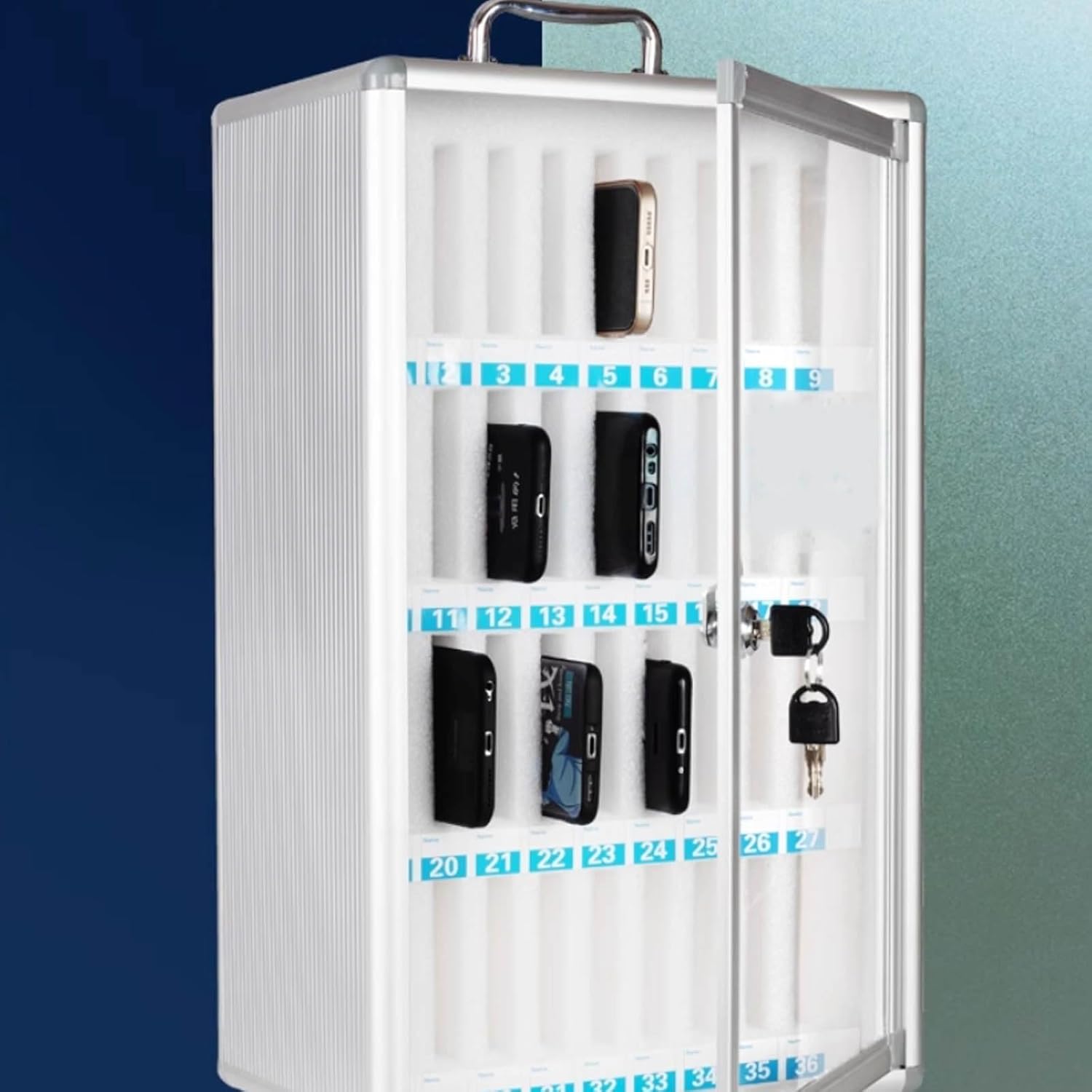 ➤ This is an aluminum alloy cell phone cabinet, it is suitable for conference room, student classroom, factory workshop, gymnasium, etc., built-in with digital number for easy access to find.➤ Product name: aluminum alloy cell phone cabinet➤ Material: aluminum alloy+glass+EVA cotton and pearl cotton➤ Size: 12 grids , 21*20*27cm/8.2*7.8*10.6in24 grids , 28*19*40cm/11*7.4*15.7in36 grids , 31*19*51cm/12.2*7.4*20in48 grids , 40*20*52cm/15.7*7.8*20.4in60 grids , 41*20*64cm/16.1*7.8*25.1in➤ Color: Silver➤ Features: 1. portable and wall mountable.2. With security lock3. With number, easy to find the phone➤ Applicable scene: meeting room, student classroom, factory workshop, gym, etc.➤ Please note.● We only sell one cell phone cabinet and its accessories, no other products are included.● We measure by hand, there may be 1-2CM error, please refer to the actual product, please understand.● Due to lighting, shooting and other reasons, the actual color of the product may be slightly different from the picture color, please understand!