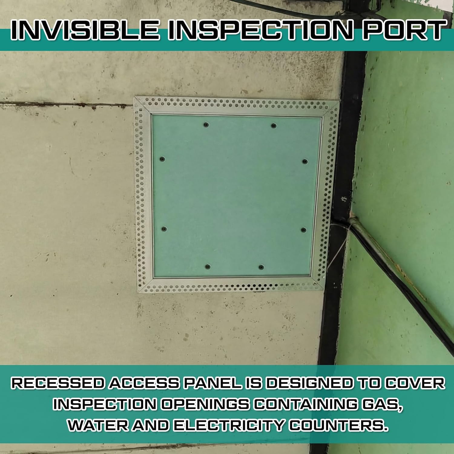 • Paintable Aluminum Drywall Access Panel with Integrated Drywall Piece in Door Frame; For Building Services: plumbing, electrical, alarm, repair, service, maintenance; Recessed access panel is designed to cover inspection openings containing gas, water and electricity counters