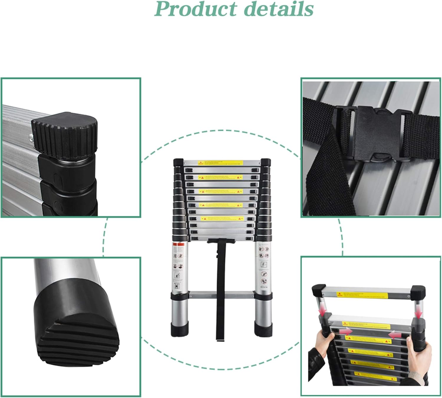 Specifications:Rung spacing: 11.81 inches (30cm)Fully extended length: 14.5 ft (4.4m)Fully retracted height: 35 inches (88cm)Weight: Approx.12.3 kg(27.12lbs)Max Load 150kg/330lbPackage Size: 97cm X 51cm X 9.5cm(Slight deviation may occur during measurement, thanks for your understanding)Description:1) This is a foldable telescopic style ladder2) Anodised aluminium finish - clean to touch3) Foldable design, convenient to use and easy to carry around4) Great helper for both indoor household use and outdoor activities5) It has rubber feet fitted to protect internal flooring and also give maximum safetyWarm Reminder:Do not put your hands or fingers between the lungs while retracting to avoid pinching; be sure that both rung hooks lock securely onto a rung of the ladder, then tie off the end of the rope to a lower rung before using