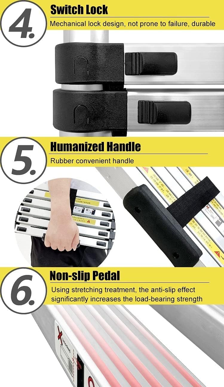 - This is our new multi-purpose folding ladder. Our ladders are lightweight, portable and suitable for a a variety of domestic and commercial uses. Using such kind of tools have already very popular in DIY projects, tradesmen, whatever garden or workshop. - SpecificationMaterial: Aluminium alloyUnfolded size: (Optional) 1.4m/4.6ft , 1.8m/5.9ft , 2m/6.6ft , 2.2m/7.2ft , 2.6m/8.5ft , 3m/9.8ft , 3.4m/11.2ft , 3.8m/12.5ft , 4.2m/13.8ft , 4.6m/15ft , 5m/16.4ft , 5.4m/17.7ft , 5.8m/19ft , 6.2m/20.3ft , 6.6m/21.6ft , 7m/23ft , 8m/26ftMaximum user weight: 150kg/ 330lb- Most liked features:For both individual and professional useDurable, and rustproof it's well worth the money - Technical features:Save space:Easily fits into cupboards, the back of a van or the boot of a car. Lightweight and easily portable .This practical and reliable ladder will prove worth its weight in gold when tackling a variety of tasks in and outside the home; no more struggling with awkwardly long extension ladders.Great for loft access, window cleaning, gutter cleaning, interior and exterior painting, general decorating, accessing cupboards, maintenance tasks and more!Thanks to the ladder's extendable design, you can safely get into smaller confined spaces which a larger ladder wouldn't allow.- Please Note: Do not place your hands or fingers between the rung when closing the ladder.- Package contents:1 x Telescopic ladder★ Note:1. Because of the manual measurement 1-3cm size error, take physical size must prevail.2. There is a slight difference between the image and the actual element caused by the brightness.3. Incorrect maintenance mode will seriously affect the appearance of the product and the useful life.4. If you have any further questions about our Ladder , please contact us first. We are happy to help you. I hope you have a wonderful li