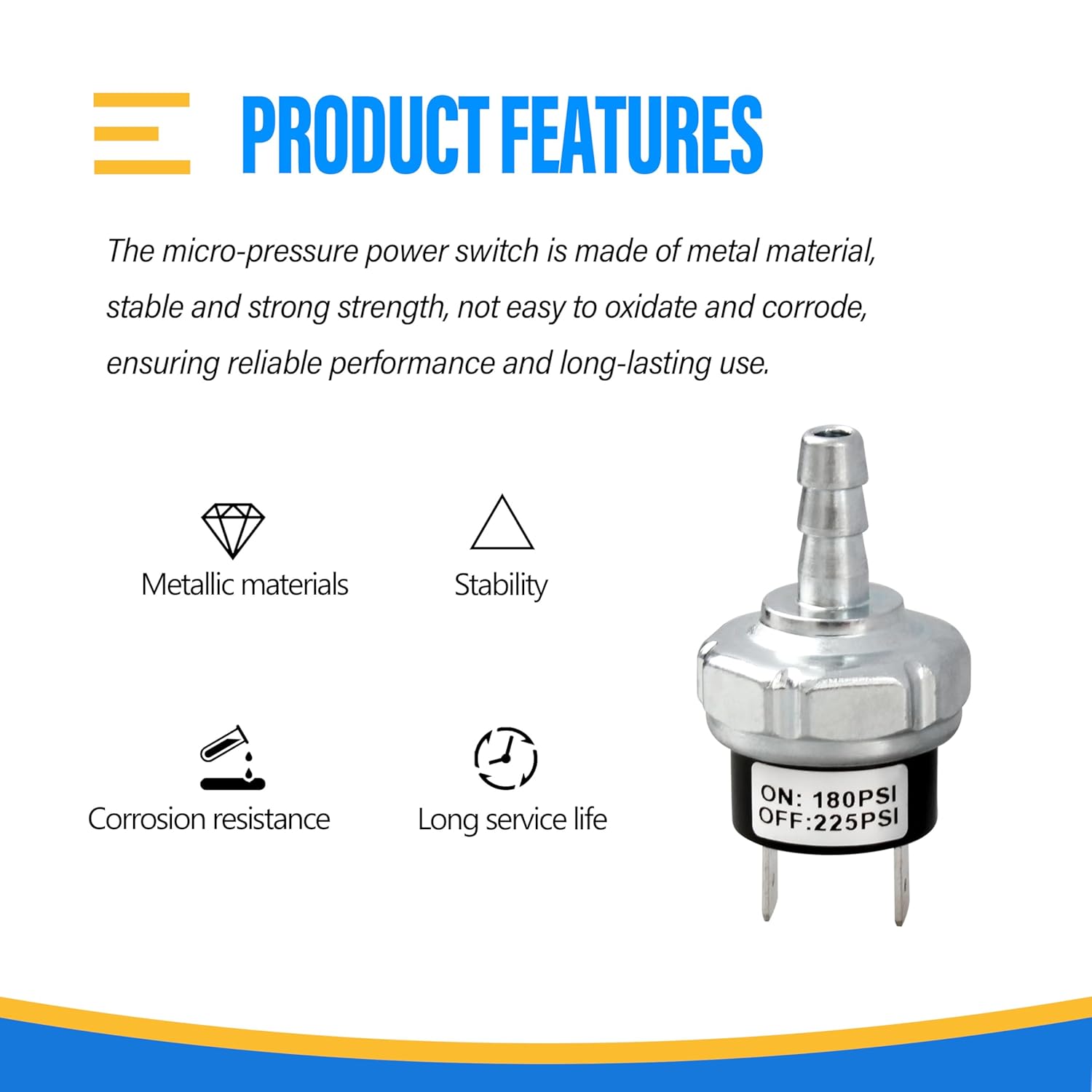 D55146 Air Compressor Micro Pressure Power Switch for Dewalt Porter Air Compressor Pressure 180-225 PSI Type 8 4.5 Gallon. Replaces Part: AB-9063290.This D55146 Air Compressor Micro Pressure Power Switch Withstand Varying Voltages(AC 110V/120V/240V or DC 12V/24V), Provides Versatility for Different Air Compressors.Widely Used:Suitable for Various Air Compressor Micro Pressure, for Dewalt Porter Air Compressor Pressure 180-225 PSI Type 8 4.5 Gallon 、D55168, D55167, D55146-CA, D55168-CAHigh Quality:The Micro Pressure Power Switch of Air Compressor Is Made of High-quality Materials, Which Are Resistant to Oxidation, Corrosion, and Have a Long Service Life.HOLEPU's Mission:HOLEPU's Mission Is To Provide Professionals And Consumers With Innovative And High-quality Products To Get The Job Done Right. HOLEPU's Products Are Built To The Highest Standards And Incorporate Many Unique Features That Make Work Easier, Faster And Cost-Effective.