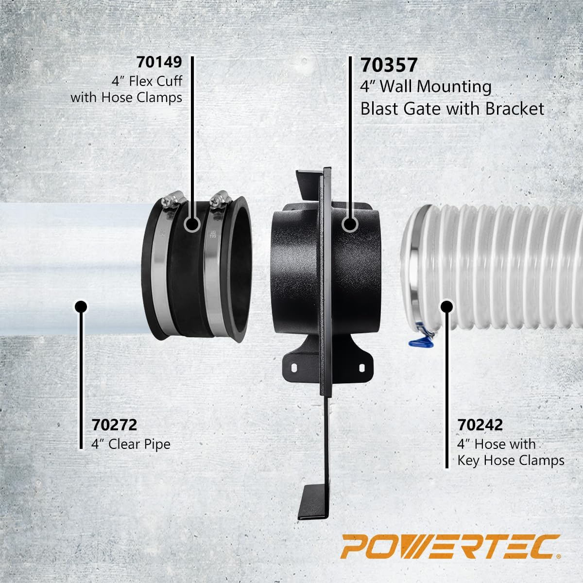 Introducing the 4 Inch Blast Gate Wall Mount by POWERTEC.The 4" blast gate that mounts to the wall is a versatile and easy-to-use accessory that helps you maintain your dust collection system at its peak performing capacity. This blast gate features a bracket, specifically designed to mount the blast gate on your wall, which makes them easy to access and use. A hose clamp is needed to connect with the hose. The sliding gate allows you to easily control the flow of air and an internal tab ensures that the gate stays in place. This convenient accessory is essential for any dust collection system, and it comes in handy every time you need to clean or make adjustments.Benefits:-Can save space in a workshop by eliminating the need for floor-mounted blast gates.-Improves the efficiency of your dust collection system.-Reduces the amount of dust that is generated.-Affordable and cost-effective.-Easy to use and install.Premium BuildThis ABS plastic fitting is ideal for dust collection, which is often exposed to harsh conditions. This material is not as susceptible to leaks as metal fittings, meeting many of the specific needs of your workshop, and will last you for years to come.NOTE: To prevent clogging and the gate from sticking, this blast gate requires regular cleaning of the dust that builds up in the groove where the gate slides.Package Contains:(4) 4 Inch Wall Mounting Threaded Blast Gate with BracketPOWERTEC is manufacturer of high-quality woodworking tools and accessories, machines, and an assortment of OEM replacement parts. We are committed to exceeding expectations while bringing the latest innovations, technology, and product development to the industry.