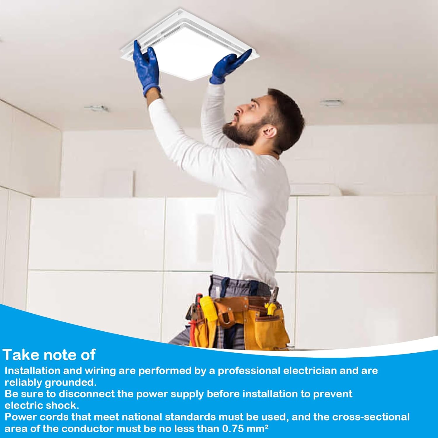 Features: Unique designs: This exhaust fan combines a powerful 110 CFM ventilation system with 18W energy-saving LED lighting. With ultra-quiet technology down to 1.0 sones, it provides a comprehensive solution for efficient dehumidification, silent operation, and comfortable lighting. The simple square panel design easily blends into any decor style, making it an ideal choice for improving bathroom air quality and lighting quality. Specifications: Material: Plastic Color: white Size: Headband: 11.81×11.81×4.33 inches / 30×30×11 cm Package Contents: 1 x bathroom exhaust fan with light Notes: Manual measurement, please allow slight errors on size. The color may exist a slight difference due to different screen displays.