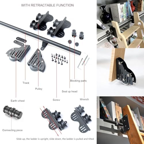 Rolling Library Ladder Rails Kit, Sliding Hardware for Retractable Mobile Ladder Tracks with Floor Roller Wheels, Easy Installation for Space Saving