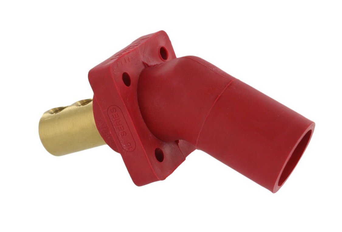 Leviton 45 degree angle single-pole panel receptacles are designed to provide superior service and durability, even under the most severe operating conditions. Featuring solid brass contacts and santoprene tpv insulators, these Devices are ideal for use in equipment associated with concerts, sound stages, movie-making, television production and many other power distribution applications. The unique 45 degree angle is perfect for applications where cables protruding 90 degree from the panel is impractical. These Leviton 16 series single-pole panel receptacles and accessories are UL/CSA listed and are completely interoperable and interchangeable with any competitive cam-type plugs and receptacles. 16 series taper nose, male, panel receptacle, cam-type, 45-degree, Green.