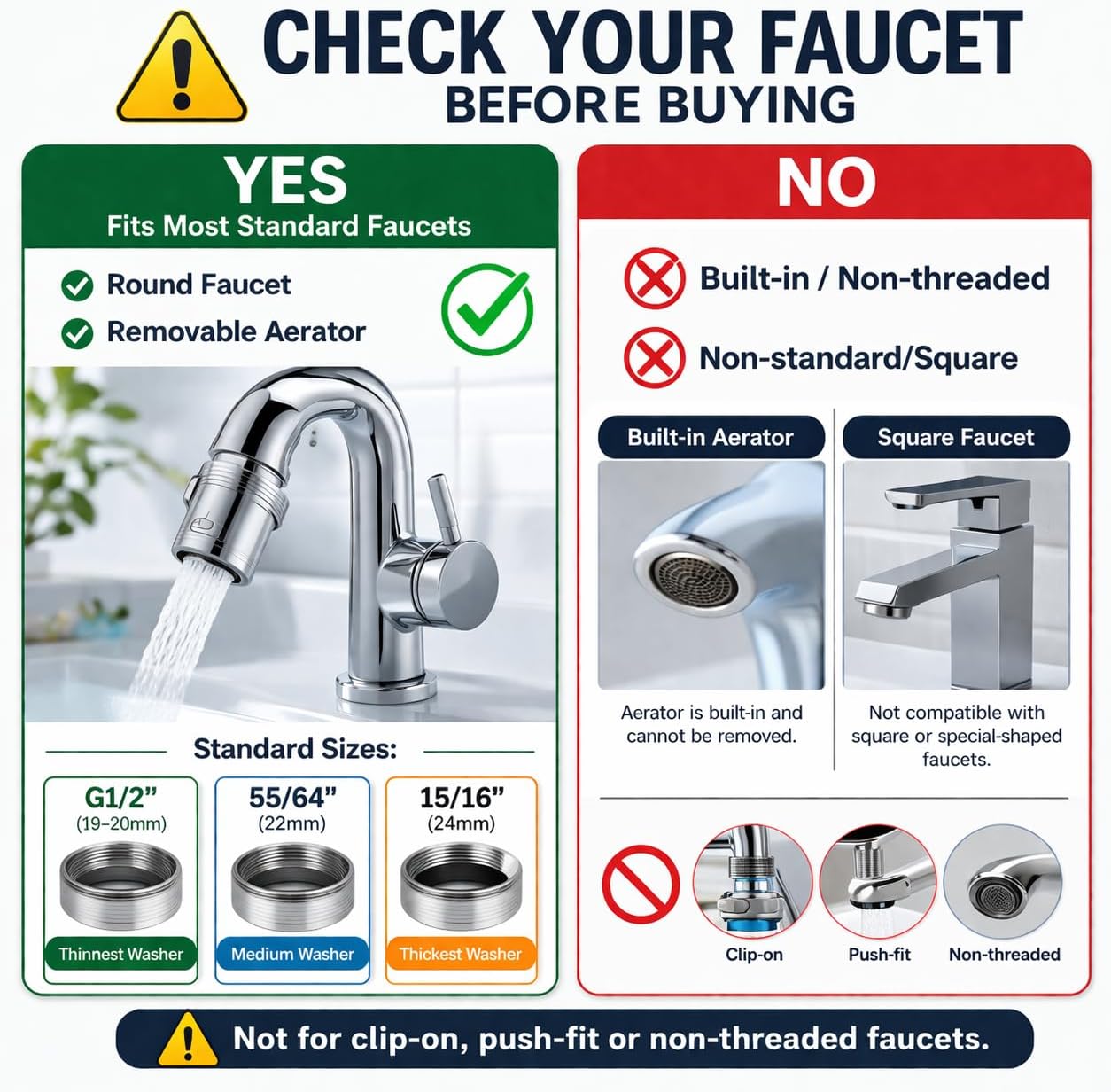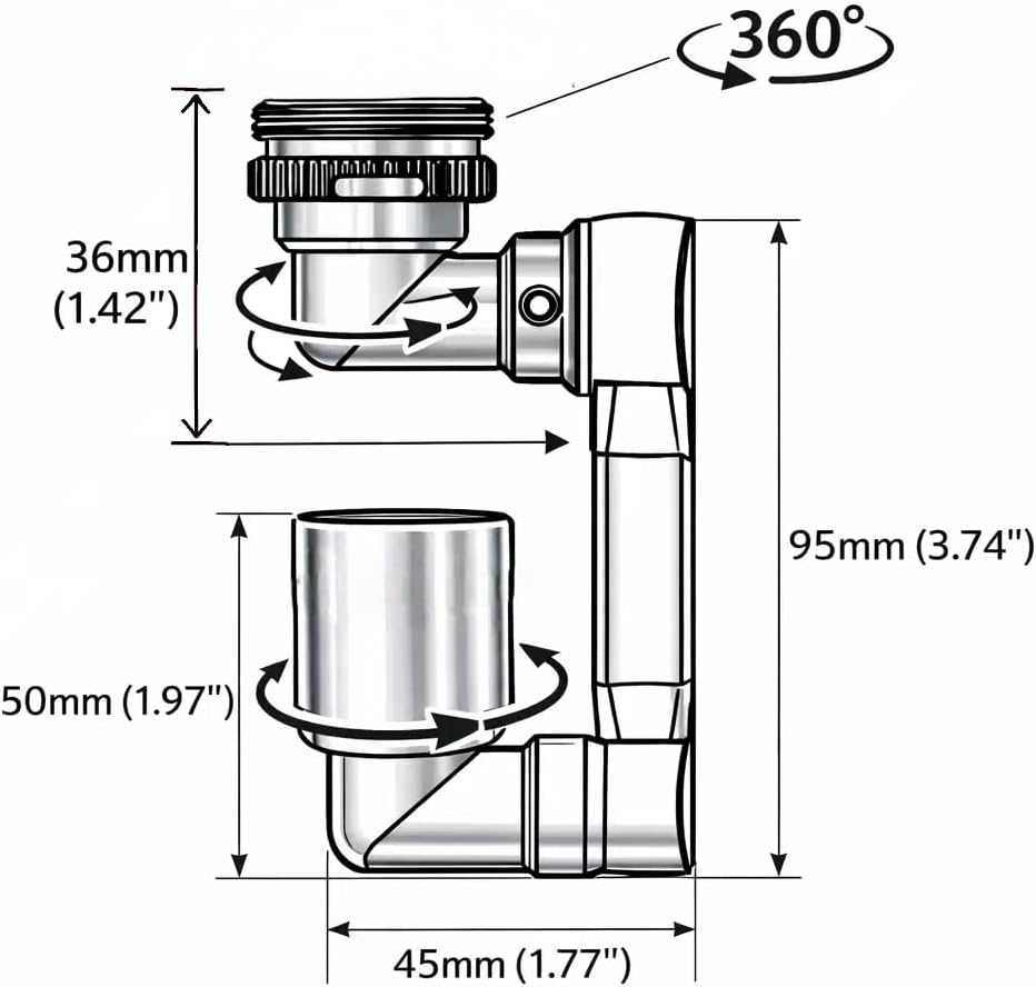 Buying Guide: Compatibility & Installation This adapter is designed to fit most standard threaded aerator faucets. To ensure proper installation, please remove your existing aerator and measure the thread diameter before purchasing. Thread & Washer Matching: 55/64" (22mm) Male Thread (External) → Use medium washer 15/16" (24mm) Female Thread (Internal) → Use thickest washer G1/2 Male Thread (19–20mm) → Use flag/tab washer Multiple washer options are included to help achieve a secure seal and reduce leakage. Important: Compatibility depends on faucet thread type and outlet structure. This adapter is intended for faucets with removable threaded aerators. Faucets with snap-on, push-fit, or non-threaded outlet designs may not be compatible. (Brass & ABS Material) Our faucet extender is constructed with premium brass and ABS materials. It has a reliable, anti-rust, and self-cleaning design. The three-layer splash filter inside the aerator removes impurities, providing a more convenient and hygienic experience. 1080°Omnidirectional Rotation - Swivel Sink Faucet extender Features 3 Flexible Joint Parts, Kitchen Faucet Adapter1080° Design of Big Rotation Angle Makes Water Can Reach Every Corner of The Kitchen Sink, Reduce Splashing in Sinks. Adjustable Two Modes - The faucet extender is Designed by ONE single switch with 2 adjustable water spray modes(Bubble, Shower), which give you different washing experience, from soft to strong without any splashing. Easy installation, Suitable for Most Types of Taps - We offer a wide range of mounting accessories to help you install your product. The product itself can fit with only three white washers on different taps with G1/2(20mm) and 55/64''(22 mm) internal thread and 15/16''(24mm) external thread.Other sizes of taps can be installed with the grey accessory set Faucet Extension Reliable and Long-Lasting – For a longer-lasting faucet, every part of the Swivel sink faucet Adapter is made with a combination of high-quality brass and matte black-finished metal. Both materials are resistant to rusting and corrosion. Also, both materials are known to be sturdy and expected to last long under normal using conditions. It is easy to clean due to its well-polished surface.